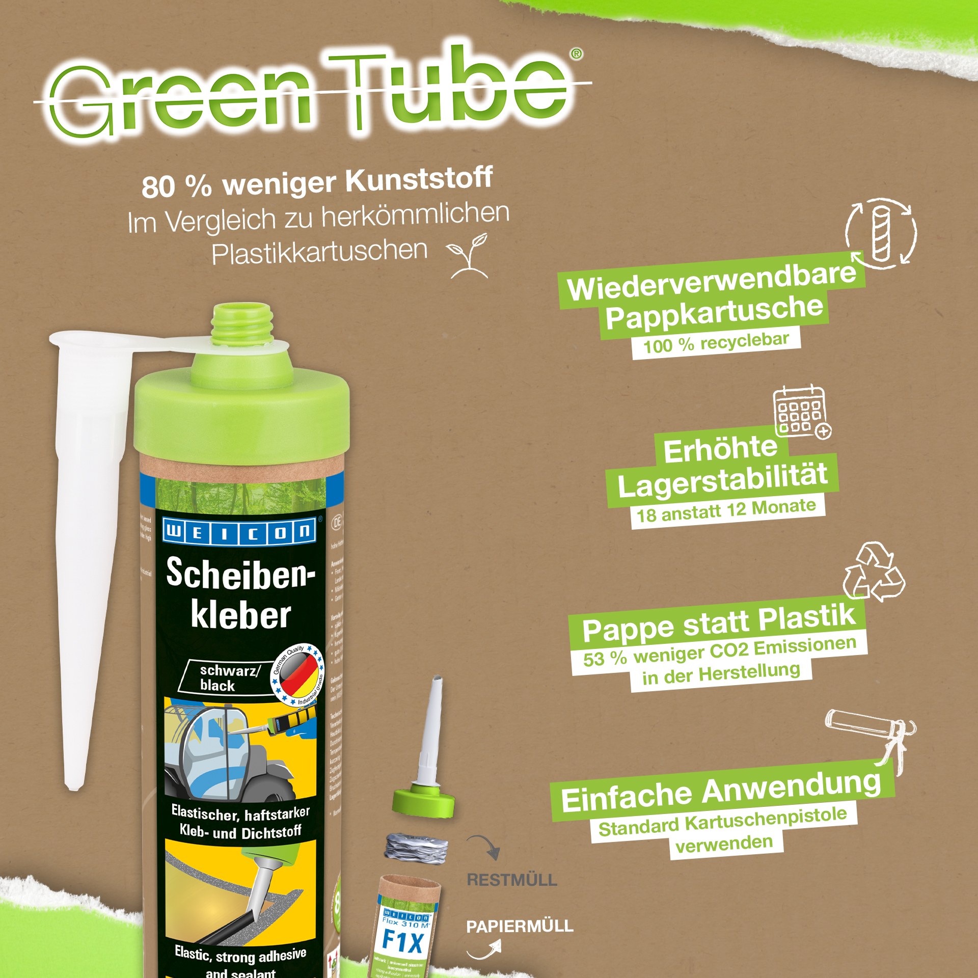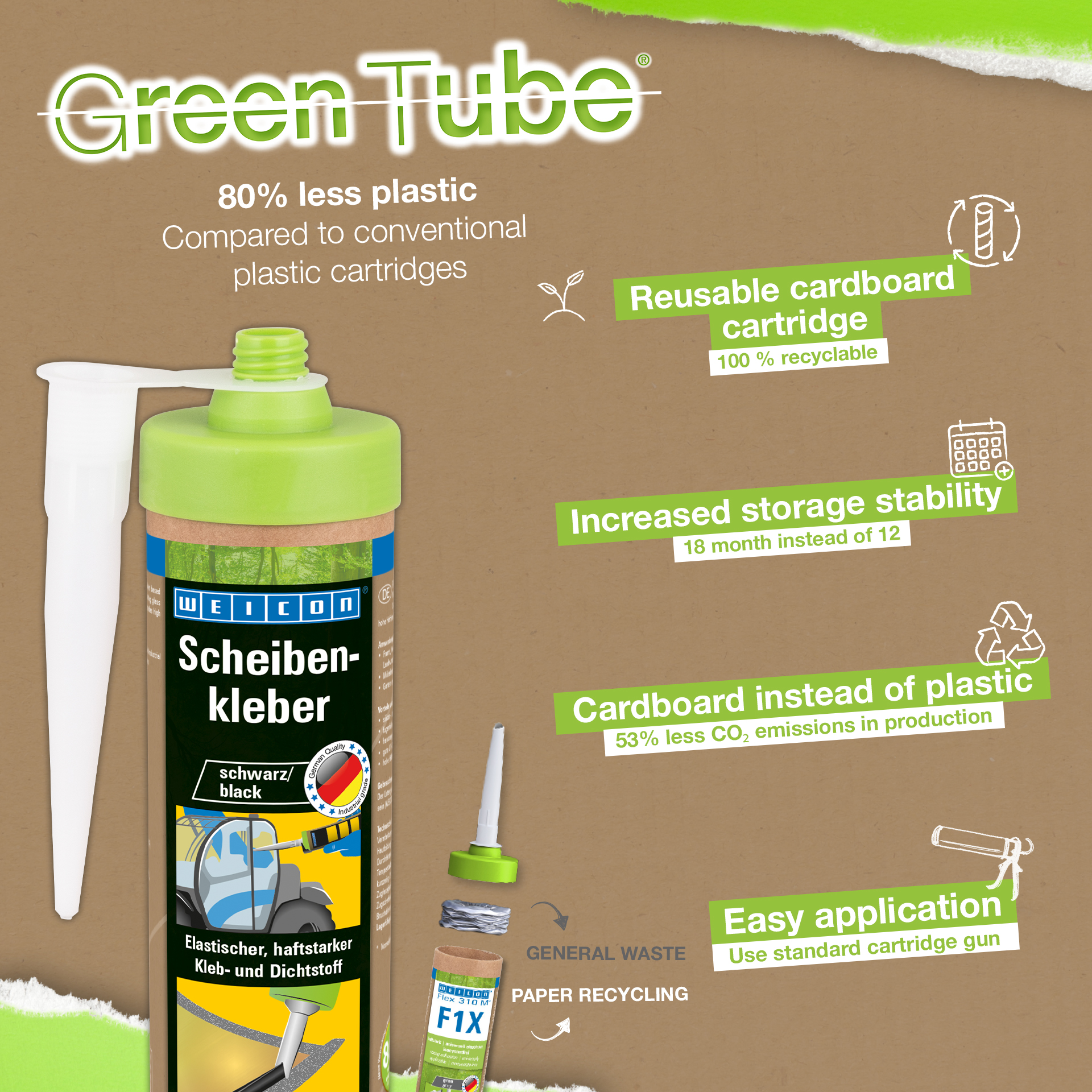 WEICON adesivo per parabrezza è un sigillante monocomponente elastico a base di polimero MS, sviluppato specialmente per il montaggio di vetri. Ad esempio, i finestrini anteriori, posteriori e laterali possono essere montati con il collante in carrelli industriali, macchine agricole e da cantiere. È adatto anche per la produzione di mobili o per il montaggio nel settore del giardinaggio e paesaggistica. Lo Scheibenkleber ha un'elevata forza adesiva su molte superfici e si indurisce mediante l’umidità dell’aria. Il collante possiede un’ottima resistenza all’invecchiamento e una buona stabilità all’esposizione a raggi UV. È riempitivo e inodore ed è esente da silicone, isocianati, alogeni e solventi.
