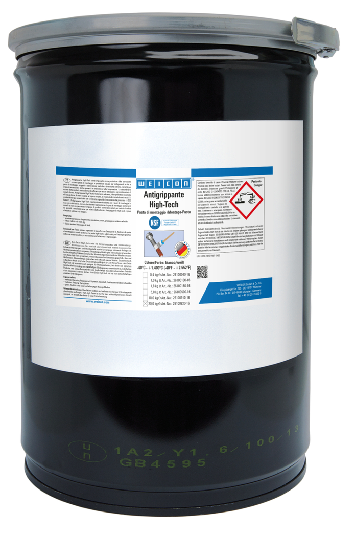 WEICON Antigrippante High-Tech è resistente ad alte temperature, ha buone proprietà distaccanti, è esente da metalli, è compatibile con qualsiasi materiale ed è certificato NSF. WEICON Antigrippante High-Tech è particolarmente idoneo quando paste metalliche potrebbero causare reazioni elettrolitiche, prodotti al nichel non possono essere usati per ragioni di salute e prodotti metallici scuri non possono essere usati per ragioni estetiche.