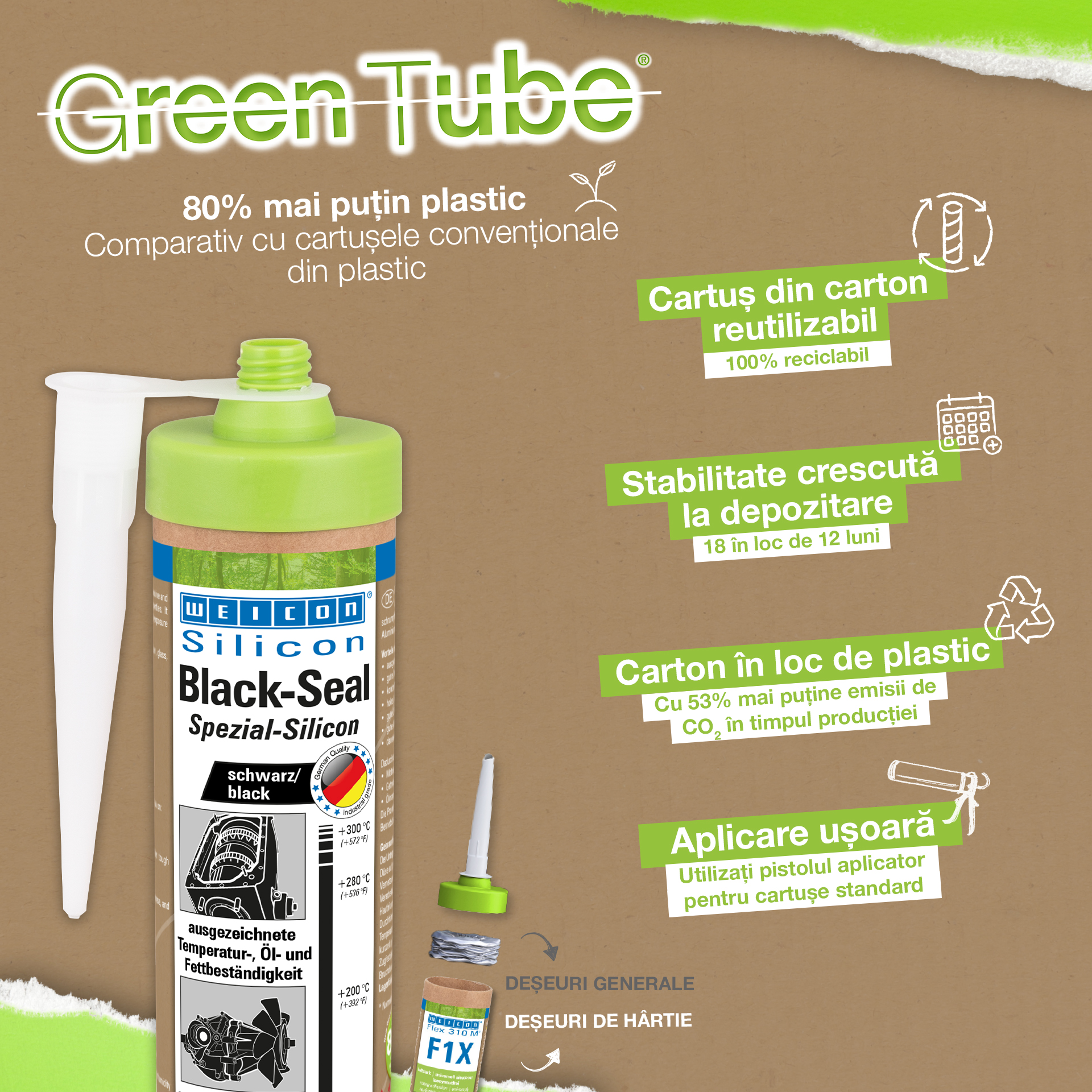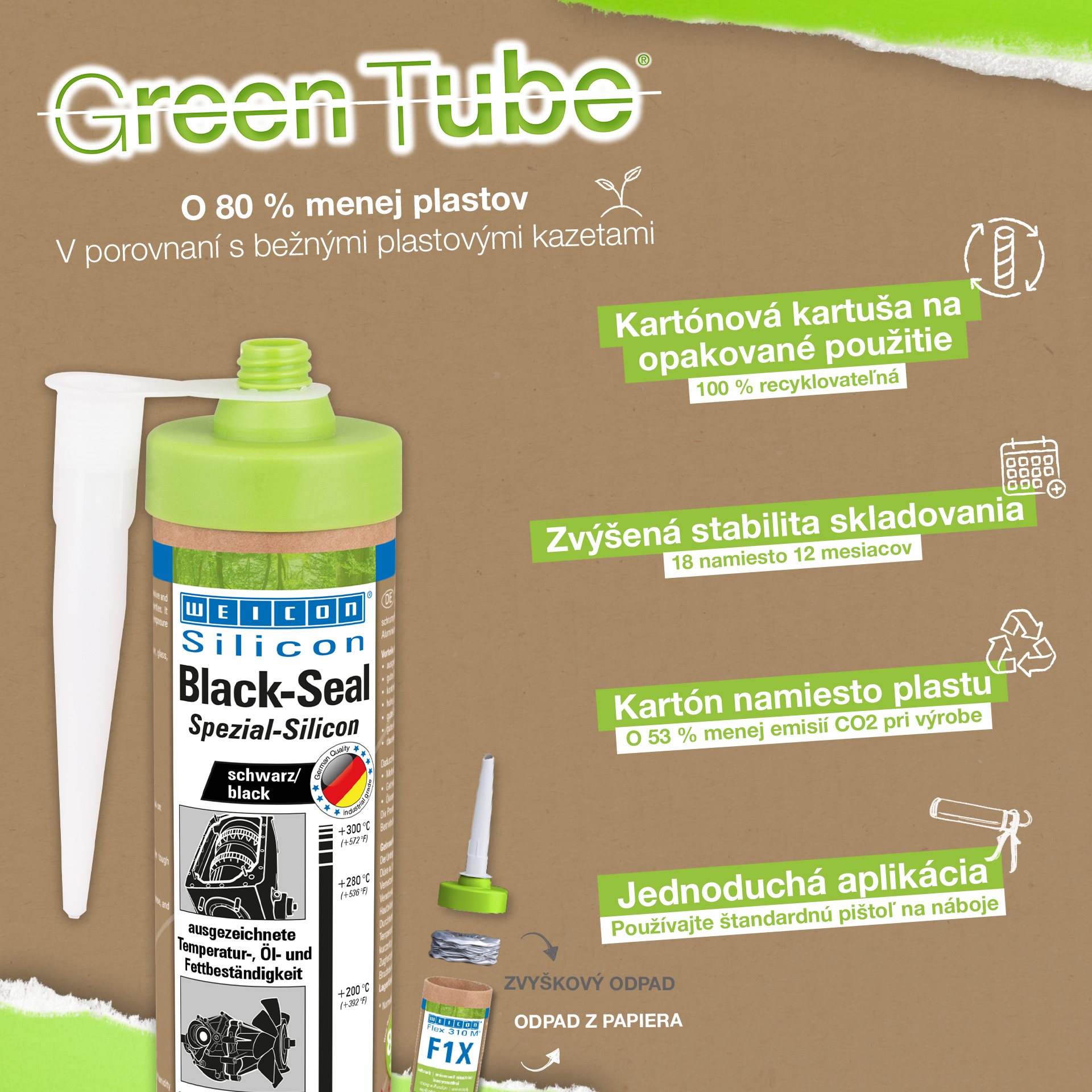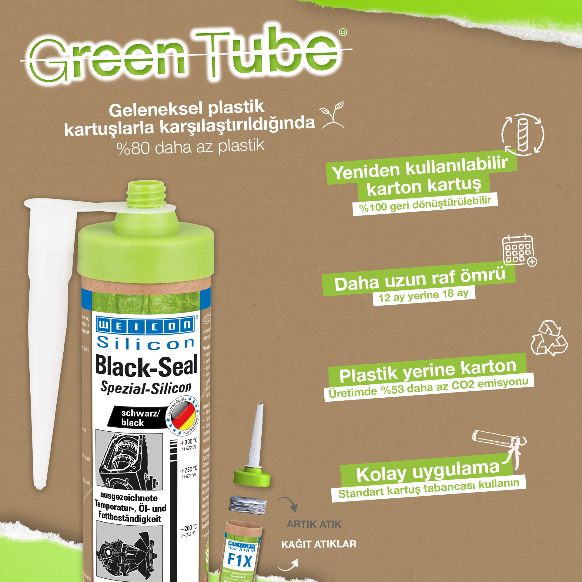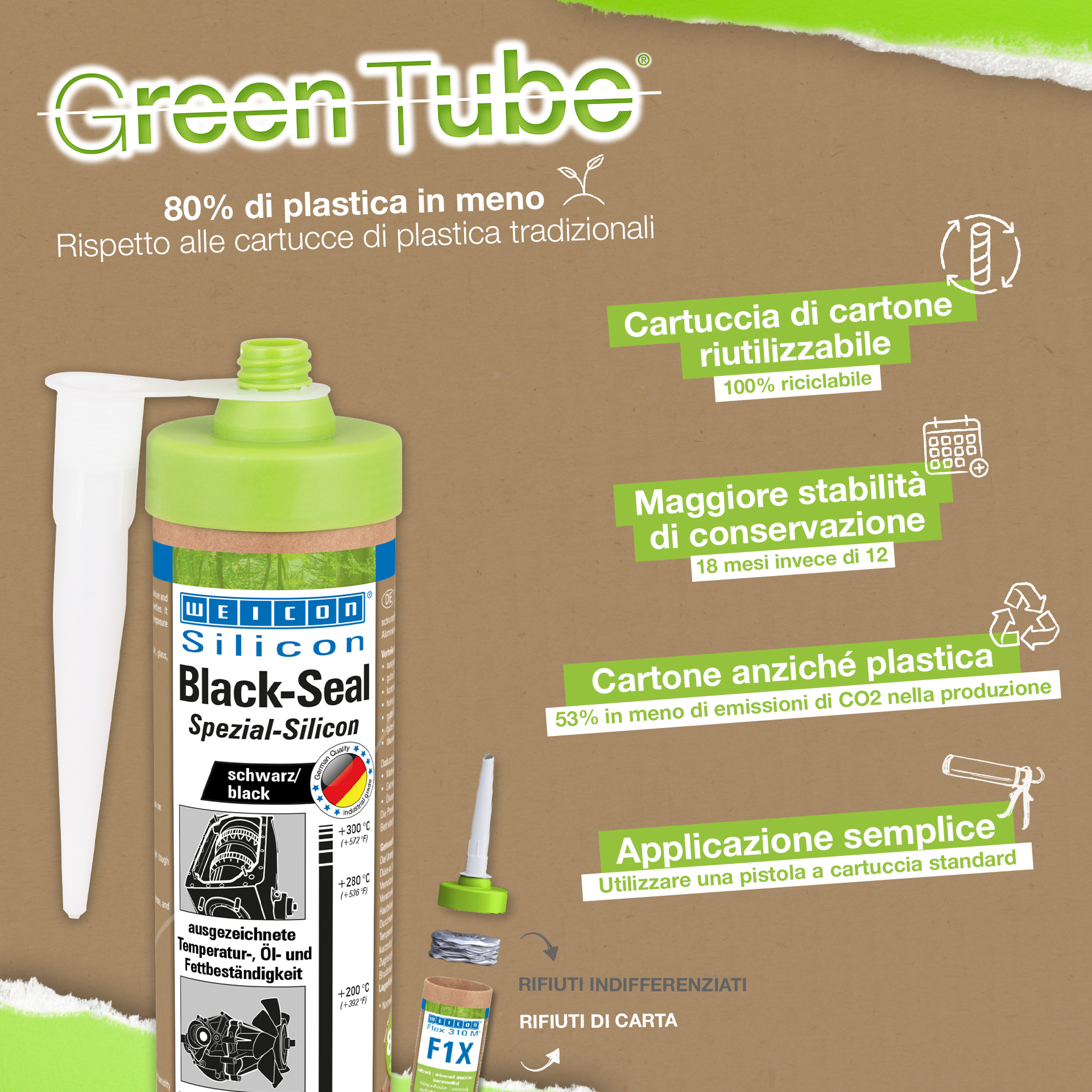 WEICON Black-Seal è resistente alle alte temperature fino a +280 °C (+536 °F), esente da solventi, possiede alta qualità adesiva, è resistente alla pressione, all’invecchiamento e molto elastico (Allungamento alla rottura del ca. 500%). WEICON Black-Seal è idoneo per incollaggi e sigillature dove sia richiesta una particolare resistenza a oli e grassi. WEICON Black-Seal trova applicazione su scatole d’ingranaggi, coperchi di valvole e di alloggiamenti, su coppe e pompe d’olio, pompe dell’acqua, scatole cambio e assi, su flange, su serbatoi, contenitori e in tanti altri settori.