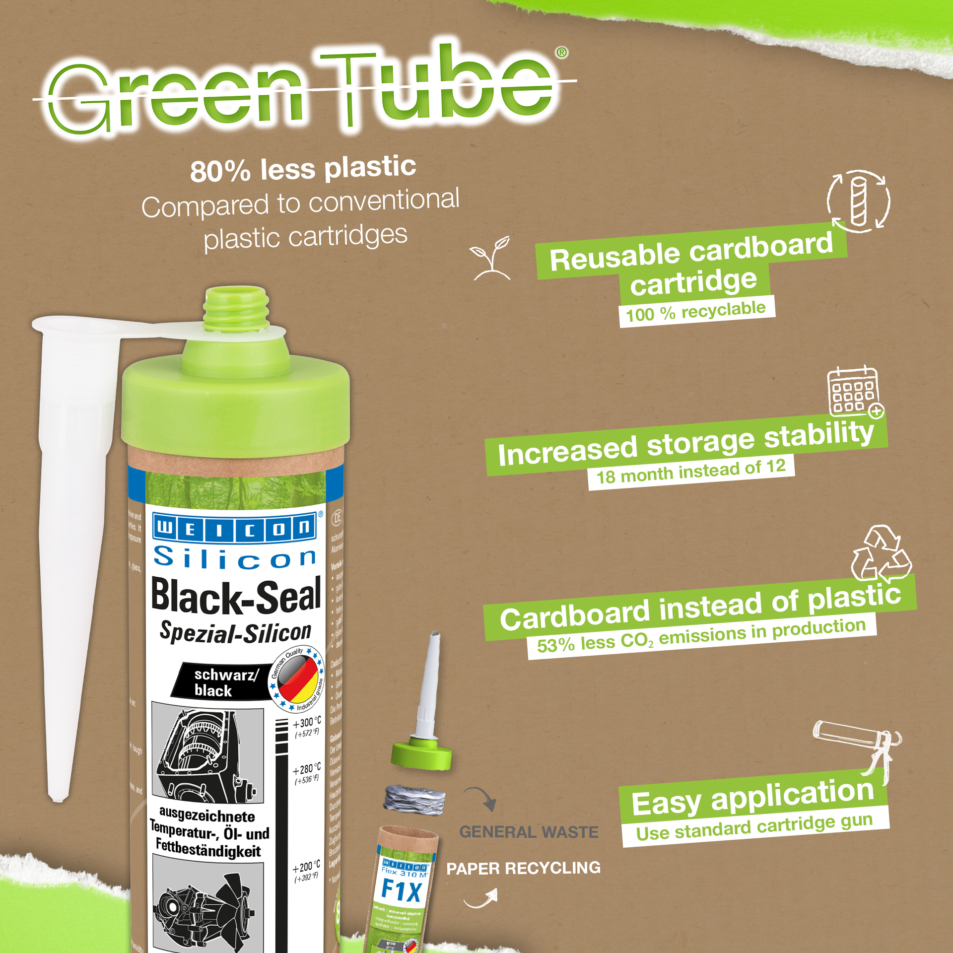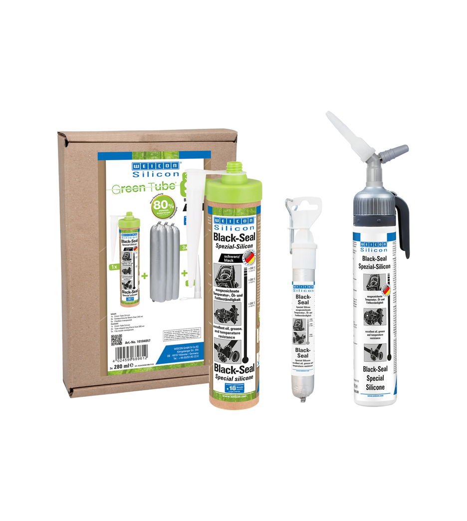 WEICON Black-Seal è resistente alle alte temperature fino a +280 °C (+536 °F), esente da solventi, possiede alta qualità adesiva, è resistente alla pressione, all’invecchiamento e molto elastico (Allungamento alla rottura del ca. 500%). WEICON Black-Seal è idoneo per incollaggi e sigillature dove sia richiesta una particolare resistenza a oli e grassi. WEICON Black-Seal trova applicazione su scatole d’ingranaggi, coperchi di valvole e di alloggiamenti, su coppe e pompe d’olio, pompe dell’acqua, scatole cambio e assi, su flange, su serbatoi, contenitori e in tanti altri settori.