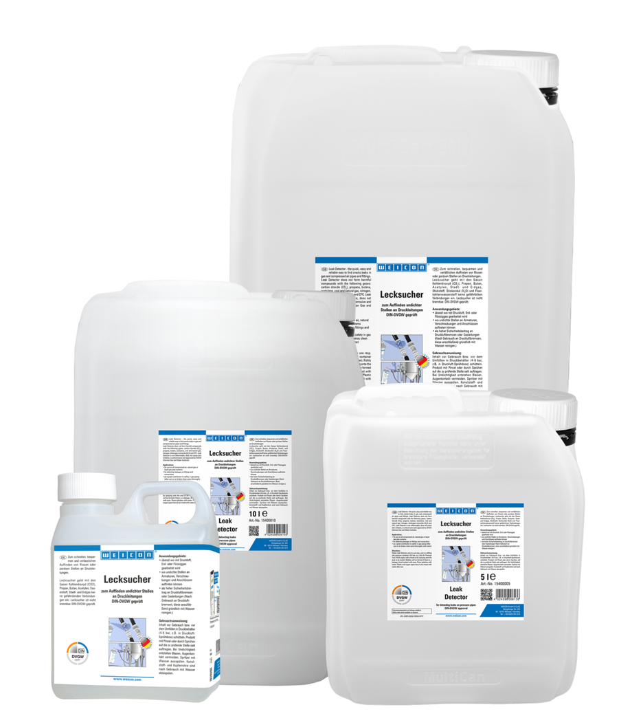 WEICON Cercafalle consente di individuare perdite (crepe o parti porose) su condotte in pressione in modo comodo, rapido e affidabile. WEICON Cercafalle non forma legami pericolosi in contatto con gas come anidride carbonica, propano, butano, acetilene, ossigeno e metano. WEICON Cercafalle è applicabile, dove si lavora con aria compressa, gas naturale o gas liquido e dove vi possono essere perdite su armature, avvitamenti o collegamenti. Inoltre è utilizzabile per aumentare la sicurezza su tubi di freni pneumatici o a gas.