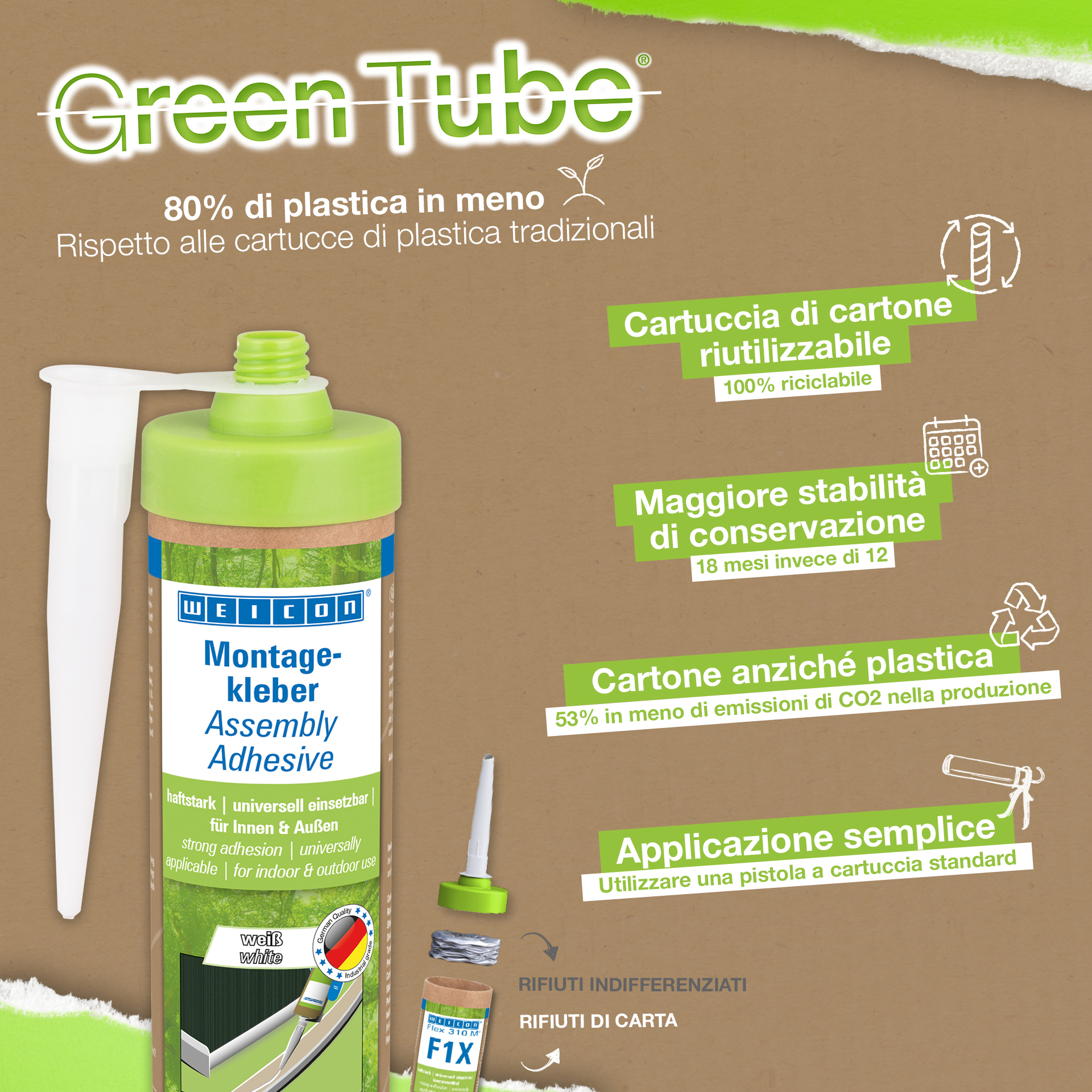 La Colla per montaggio WEICON è un adesivo acrilico a forte dispersione per lavori di assemblaggio, riparazione e ritocco. La colla ha un'elevata adesione iniziale e resistenza finale e polimerizza rapidamente. Dopo l'asciugatura, l'adesivo di montaggio può essere carteggiato e stuccato e può essere verniciato con i colori e le vernici disponibili in commercio. L'adesivo è resistente alle temperature comprese tra -20 °C e +80 °C ed è adatto sia per applicazioni interne che esterne. L'adesivo flessibile bianco è a basse emissioni e privo di solventi. L'adesivo di montaggio è di impiego universale e può essere utilizzato per un'ampia gamma di applicazioni. È ideale, ad esempio, per l'incollaggio superficiale di materiali a base di legno (come battiscopa, listelli decorativi, pannelli o pannelli truciolari), PVC, polistirolo, pannelli in polistirene espanso, schiuma rigida PU (ad esempio pannelli isolanti e canaline per cavi), materiali minerali (ad esempio piastrelle) e metalli su substrati assorbenti come intonaco, calcestruzzo, fibrocemento, cartongesso e legno non trattato. Confezionamento sostenibile - altrettanto resistente! Green Tube, il packaging sostenibile: la punta e il coperchio sono realizzati in plastica riciclata al 100% e il corpo della cartuccia è interamente in cartone. Questo significa minori emissioni di CO₂ e un ridotto utilizzo di plastica rispetto alle cartucce convenzionali, il tutto senza compromettere le prestazioni!