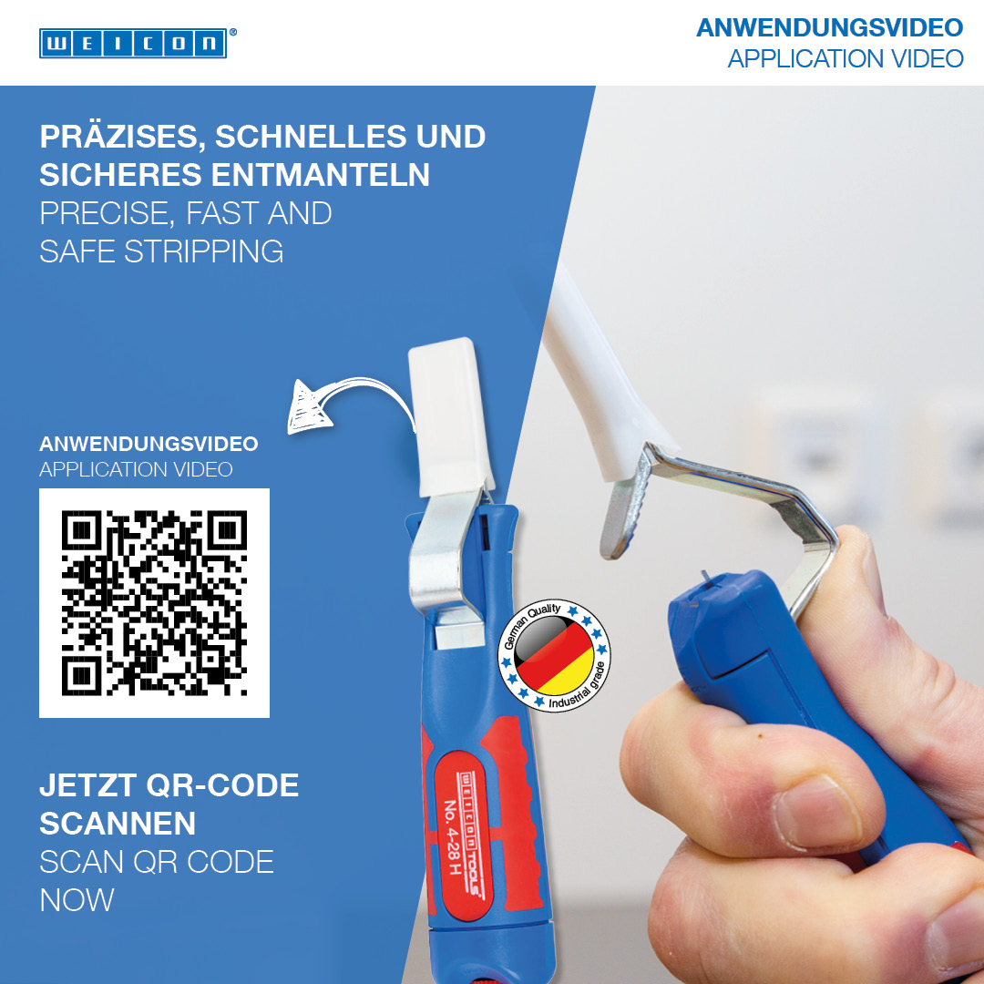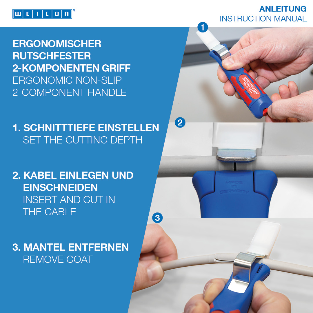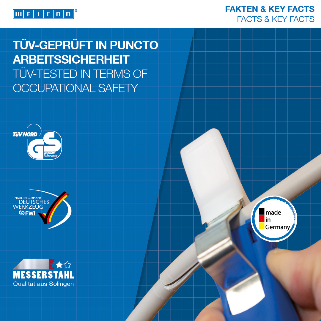 Impugnatura dall’ampio diametro, ottimale al tatto Regolazione continua e vite di regolazione facilmente controllabile Strippaggio preciso, rapido e sicuro Cambio rapido della lama interna grazie alla chiusura a baionetta