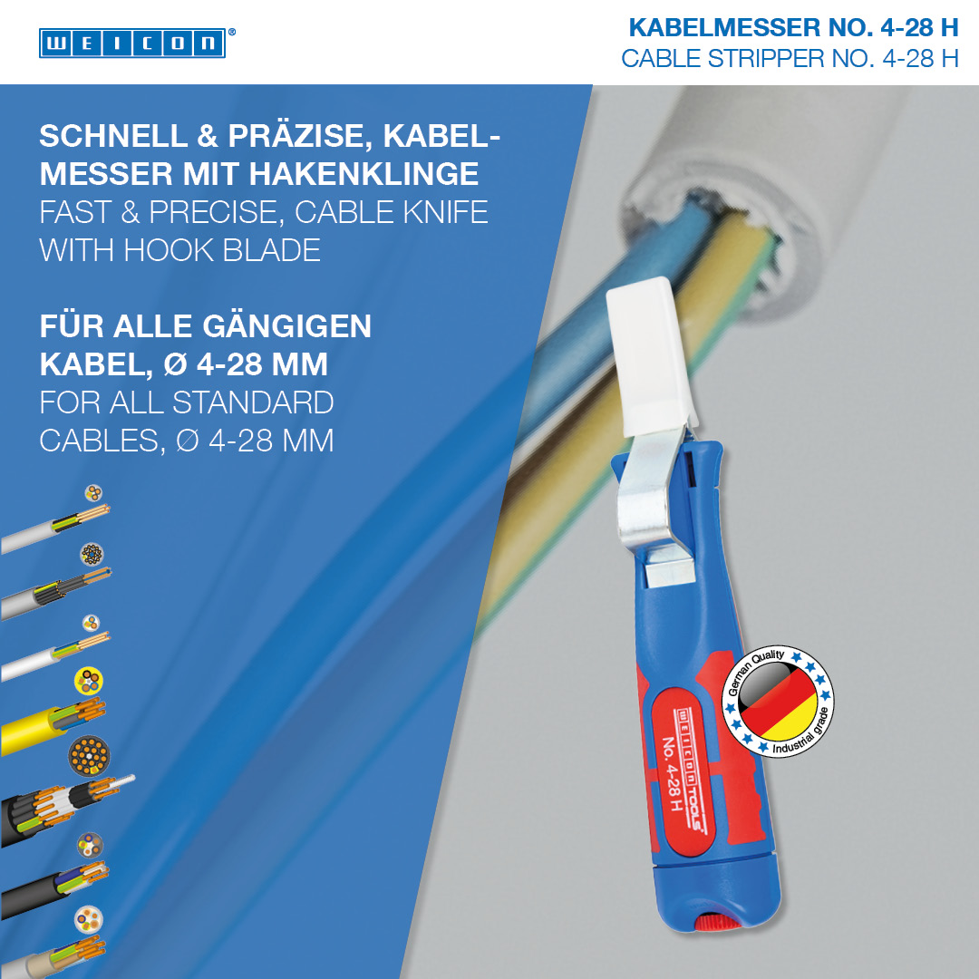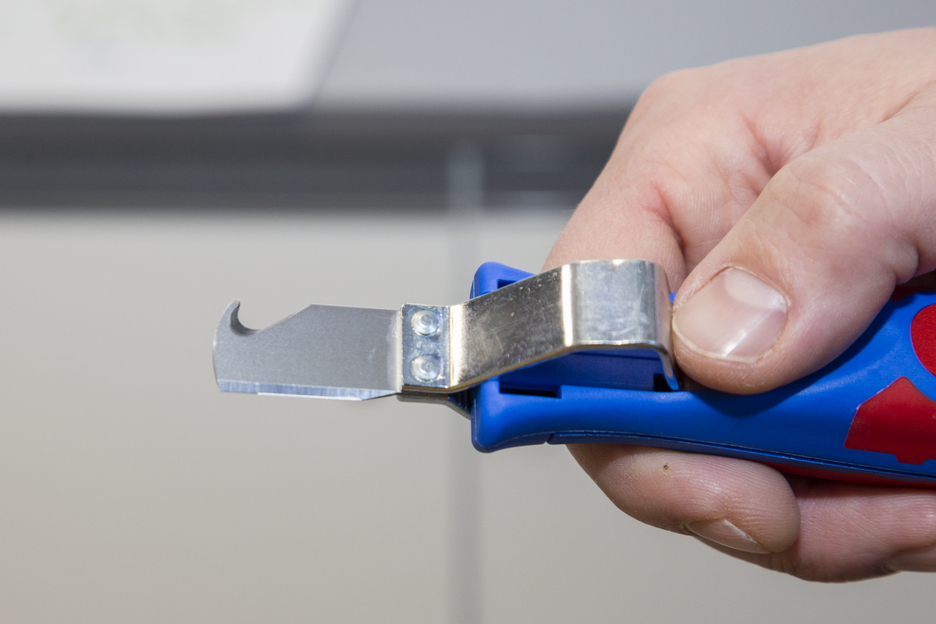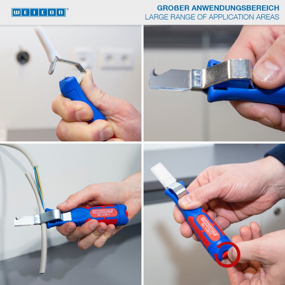 con impugnatura ambidestra con lama a uncino e cappuccio di protezione, range di lavoro 4 - 28 mm Ø
