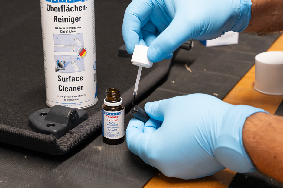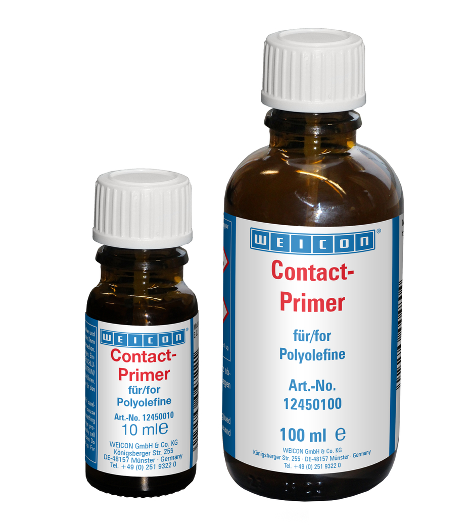 Molti tipi di plastica non possono essere incollati, o solo parzialmente, senza un pretrattamento. Pretrattando queste plastiche con WEICON Primer Contact per poliolefine, si ottiene un cambiamento nella struttura superficiale. Questo consente di unire plastiche solitamente difficili da incollare, per esempio, polietilene (PE) e polipropilene (PP) del gruppo delle poliolefine. Perfino elastomeri termoplastici (TPE), Teflon® (PTFE) e materiali sintetici parenti oltre ai i siliconi possono essere in Perfino elastomeri termoplastici (TPE), Teflon® (PTFE) e materiali sintetici parenti oltre ai siliconi possono essere incollati con WEICON CONTACT se usati in combinazione con WEICON Primer Contact per poliolefine.