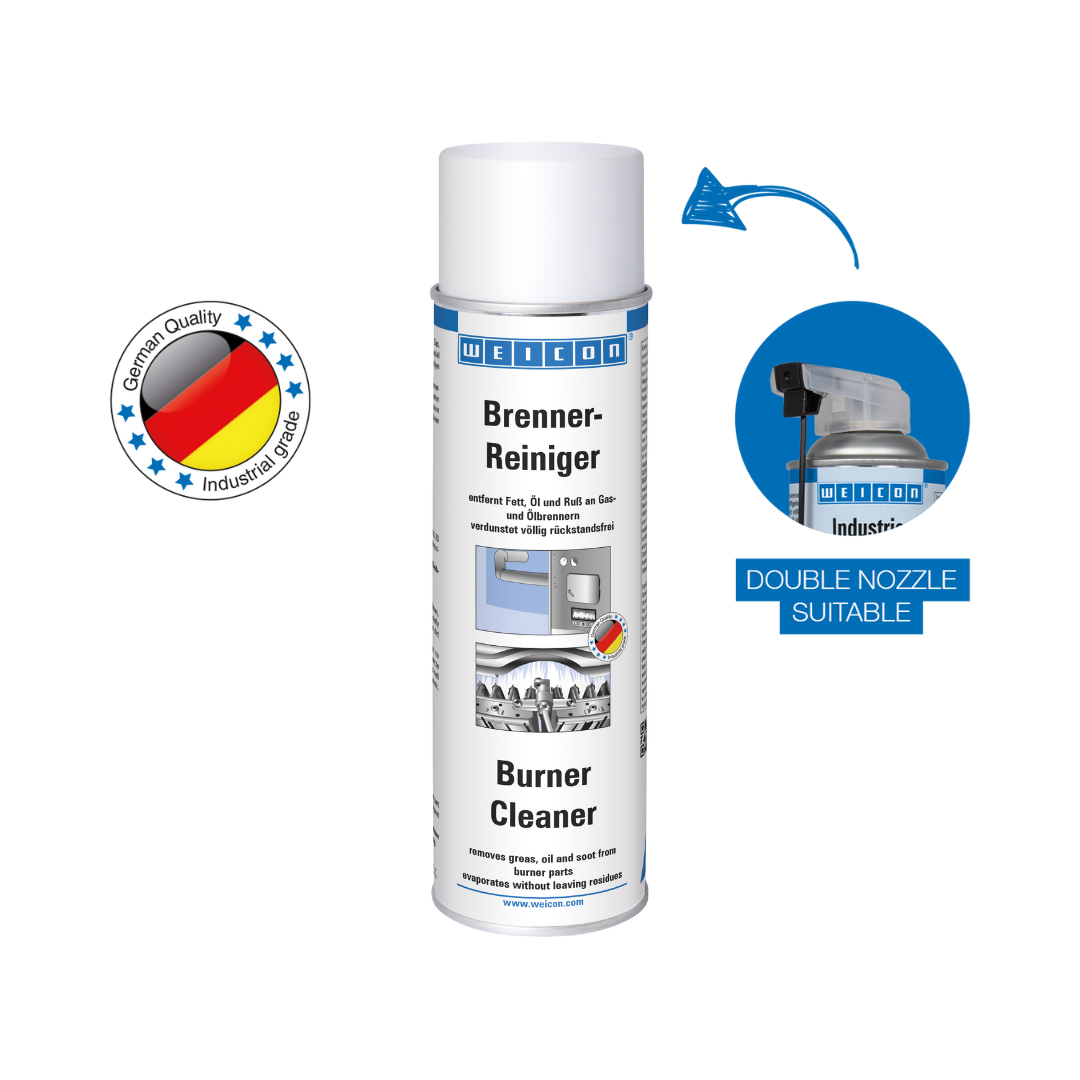 WEICON Detergente per Bruciatori è un detergente speciale per la rimozione di grassi, olio, fuliggine e altri tipi di residui su parti di bruciatori. Il detergente evapora senza lasciare residui. Lo spray trova applicazione su connessioni e deflettori, sulle pale dei ventilatori e sulle superfici interne del bruciatore, elettrodi, ecc.