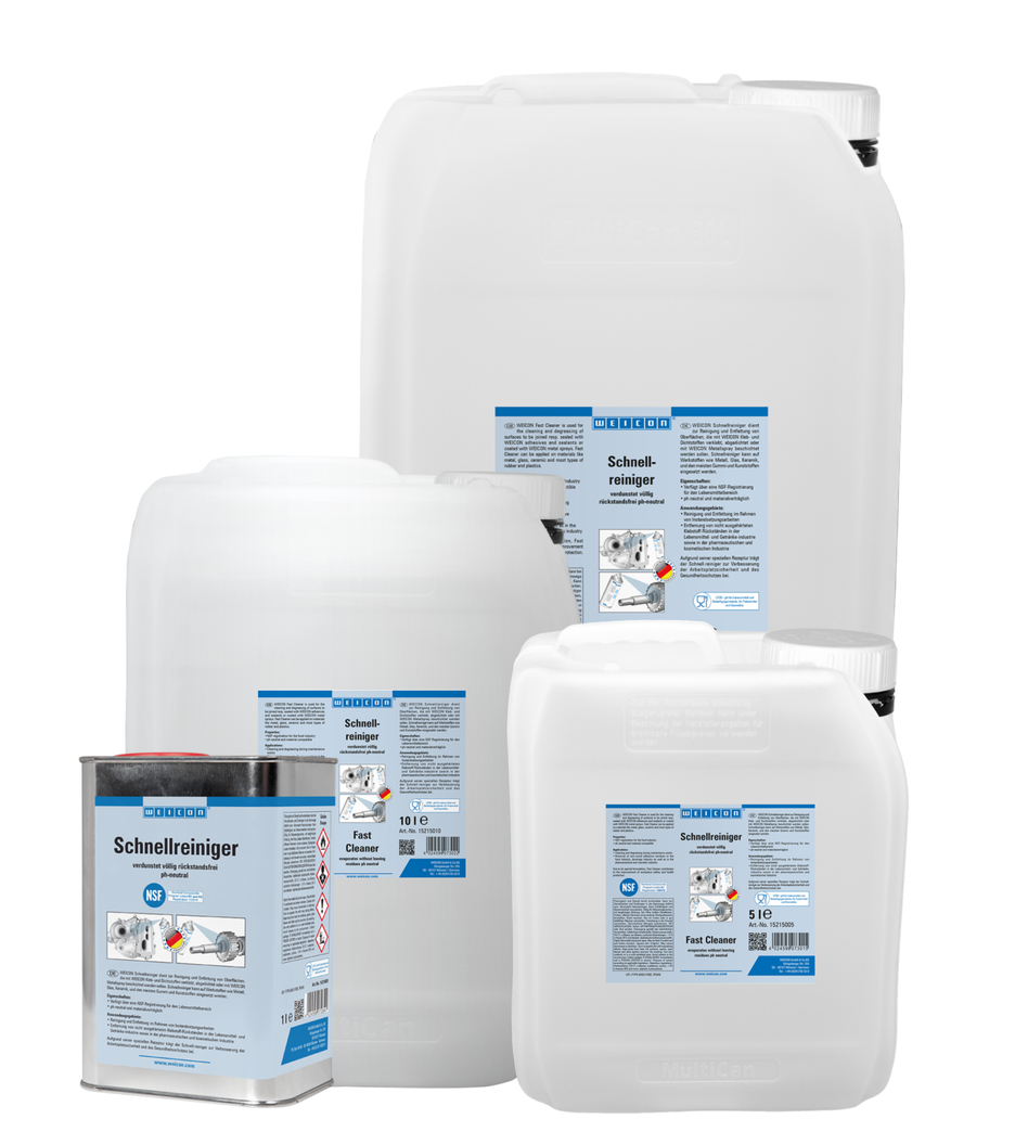 WEICON Detergente Rapido dispone di una registrazione NSF per il settore alimentare e può essere utilizzato come pulitore e sgrassante per la rimozione di sporcizia nell’ambito della manutenzione e per togliere residui di colla nell’industria alimentare, delle bevande, nell’industria farmacologica e cosmetica. WEICON Detergente Rapido trova utilizzo per la pulizia e lo sgrassaggio di superfici destinati e alla sigillatura/incollaggio con sigillanti/collanti WEICON o rivestiti con Spray Metallici WEICON. WEICON Detergente Rapido è a pH neutro, non intacca i materiali e può essere utilizzato su metallo, vetro, ceramica, e su quasi tutti i tipi di gomma e plastiche. Per merito della composizione speciale e della conseguente registrazione NSF, WEICON Detergente Rapido contribuisce al miglioramento della sicurezza e della salute sul posto di lavoro.
