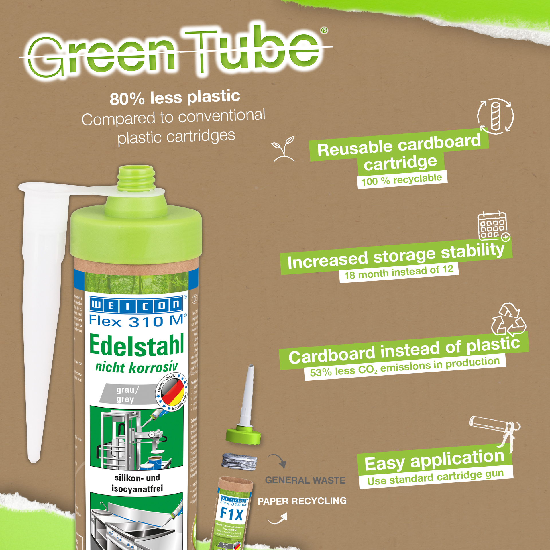 WEICON Flex 310 M Acciaio INOSSIDABILE non è corrosivo, possiede un’ottima qualità di adesione, è verniciabile bagnato su bagnato, levigabile, resistente agli agenti atmosferici e ai raggi UV ed esente da siliconi, isocianati, alogeni e solventi. Il prodotto è certificato ISEGA e può essere utilizzato nell’industria alimentare. Flex 310 M Acciaio INOSSIDABILE è un collante elastico a base di polimeri MS ed è ideale per incollaggi e sigillature su metalli come acciaio inossidabile, alluminio e metalli non ferrosi. Trova applicazione laddove il sigillante o il collante devono avere lo stesso colore del materiale (p. es. acciaio inox, alluminio). WEICON Flex 310 M Acciaio inossidabile è adatto per applicazioni nel settore del metallo, nella costruzione di serbatoi e apparecchiature, nell’industria alimentare, per la costruzione di cucine, nel settore di impianti sanitari, impianti di ventilazione e condizionatori e dove l’utilizzo di siliconi o prodotti contenenti siliconi non è gradito.