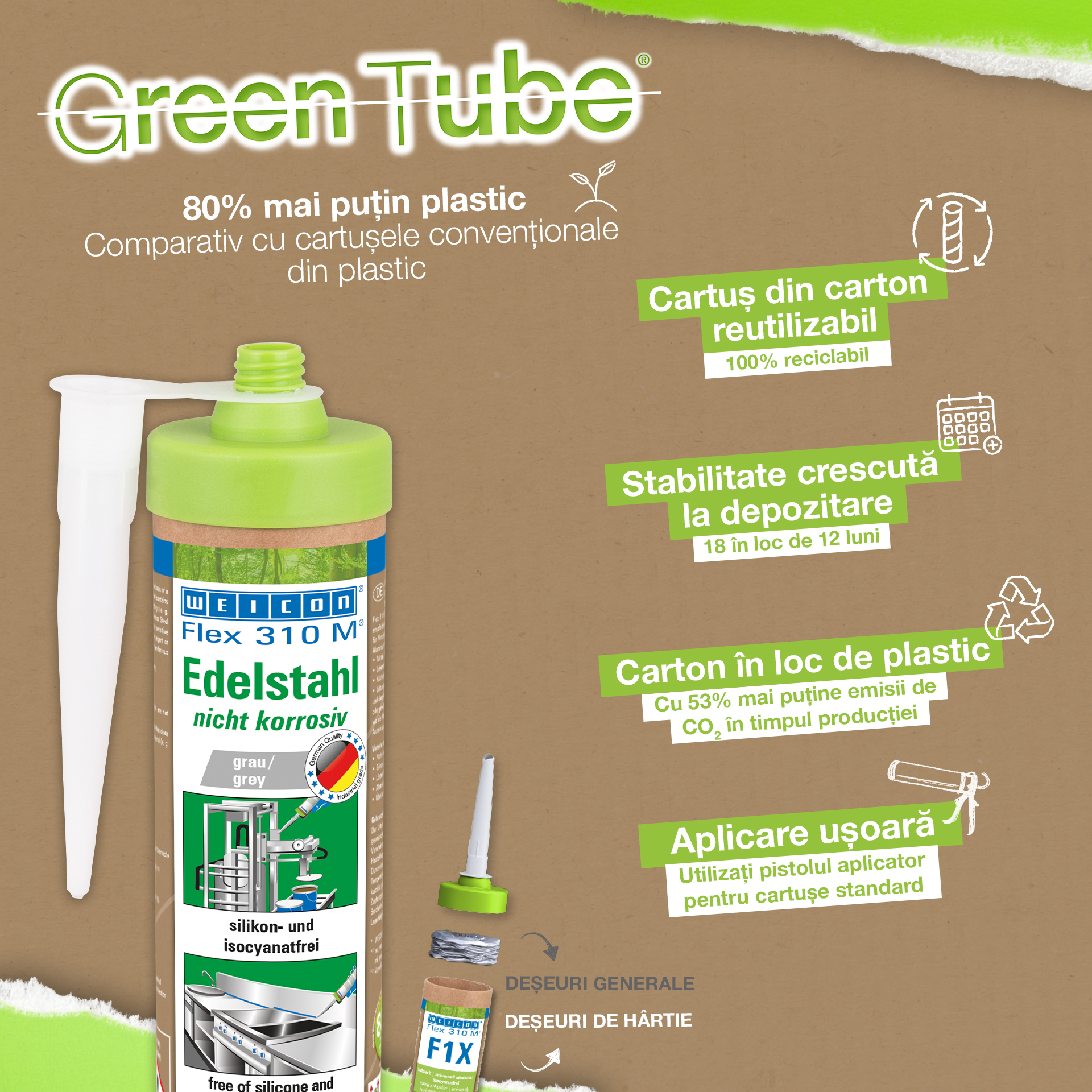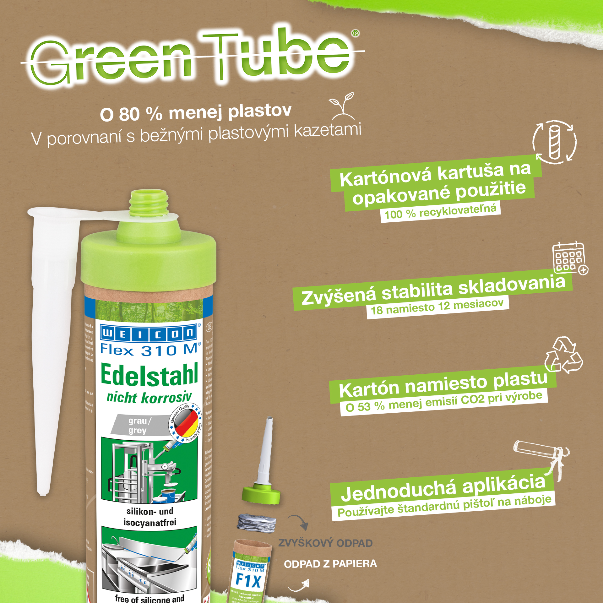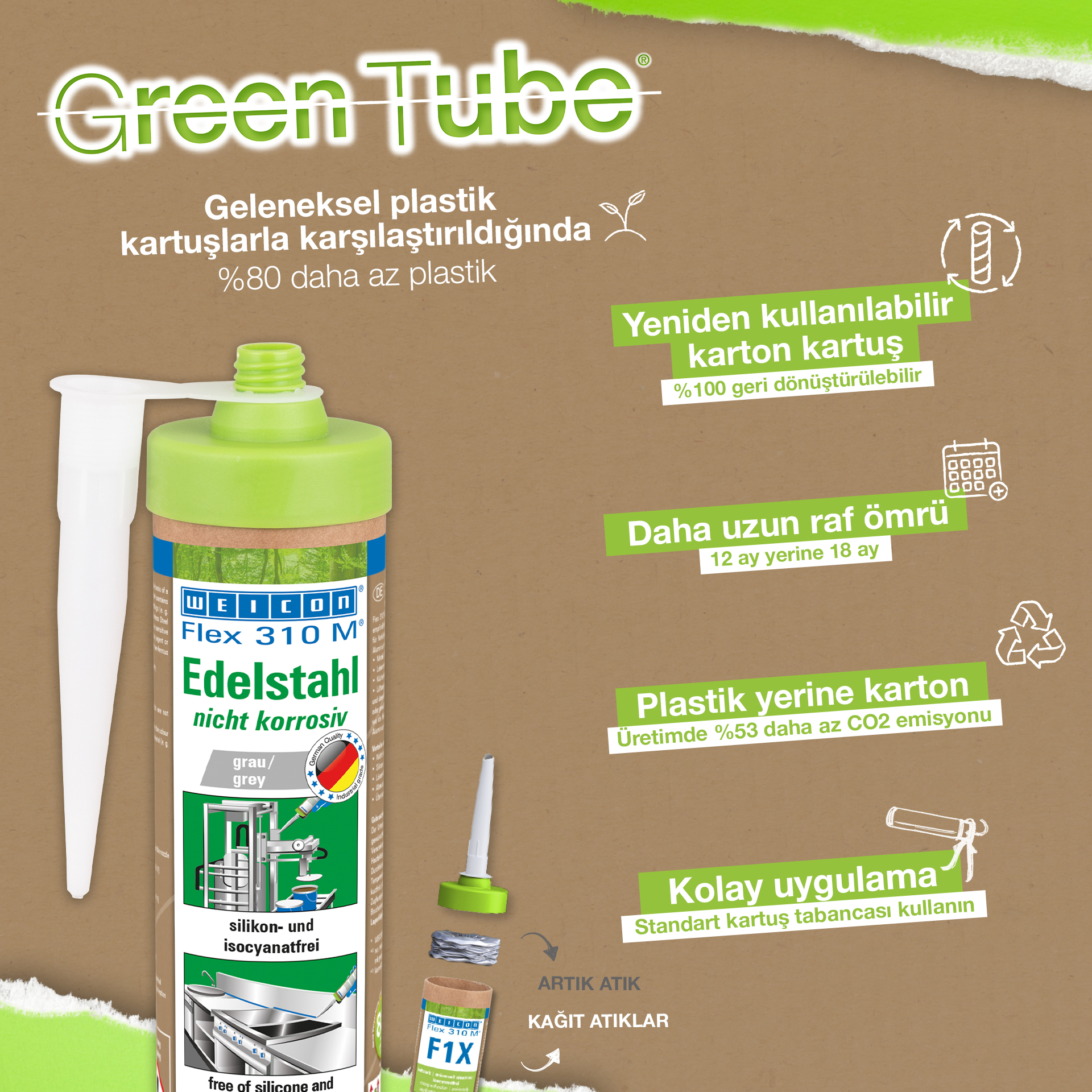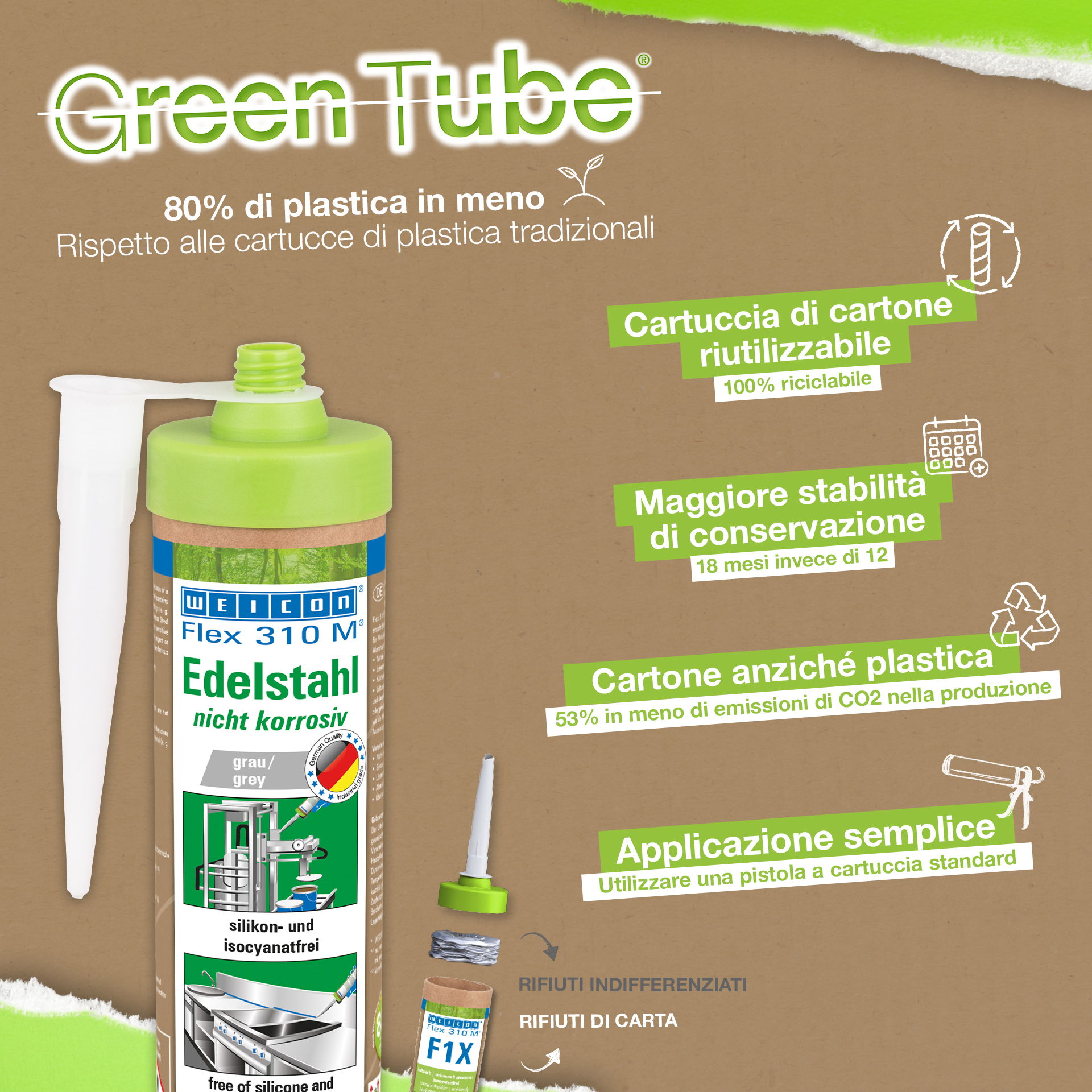 WEICON Flex 310 M Acciaio INOSSIDABILE non è corrosivo, possiede un’ottima qualità di adesione, è verniciabile bagnato su bagnato, levigabile, resistente agli agenti atmosferici e ai raggi UV ed esente da siliconi, isocianati, alogeni e solventi. Il prodotto è certificato ISEGA e può essere utilizzato nell’industria alimentare. Flex 310 M Acciaio INOSSIDABILE è un collante elastico a base di polimeri MS ed è ideale per incollaggi e sigillature su metalli come acciaio inossidabile, alluminio e metalli non ferrosi. Trova applicazione laddove il sigillante o il collante devono avere lo stesso colore del materiale (p. es. acciaio inox, alluminio). WEICON Flex 310 M Acciaio inossidabile è adatto per applicazioni nel settore del metallo, nella costruzione di serbatoi e apparecchiature, nell’industria alimentare, per la costruzione di cucine, nel settore di impianti sanitari, impianti di ventilazione e condizionatori e dove l’utilizzo di siliconi o prodotti contenenti siliconi non è gradito.