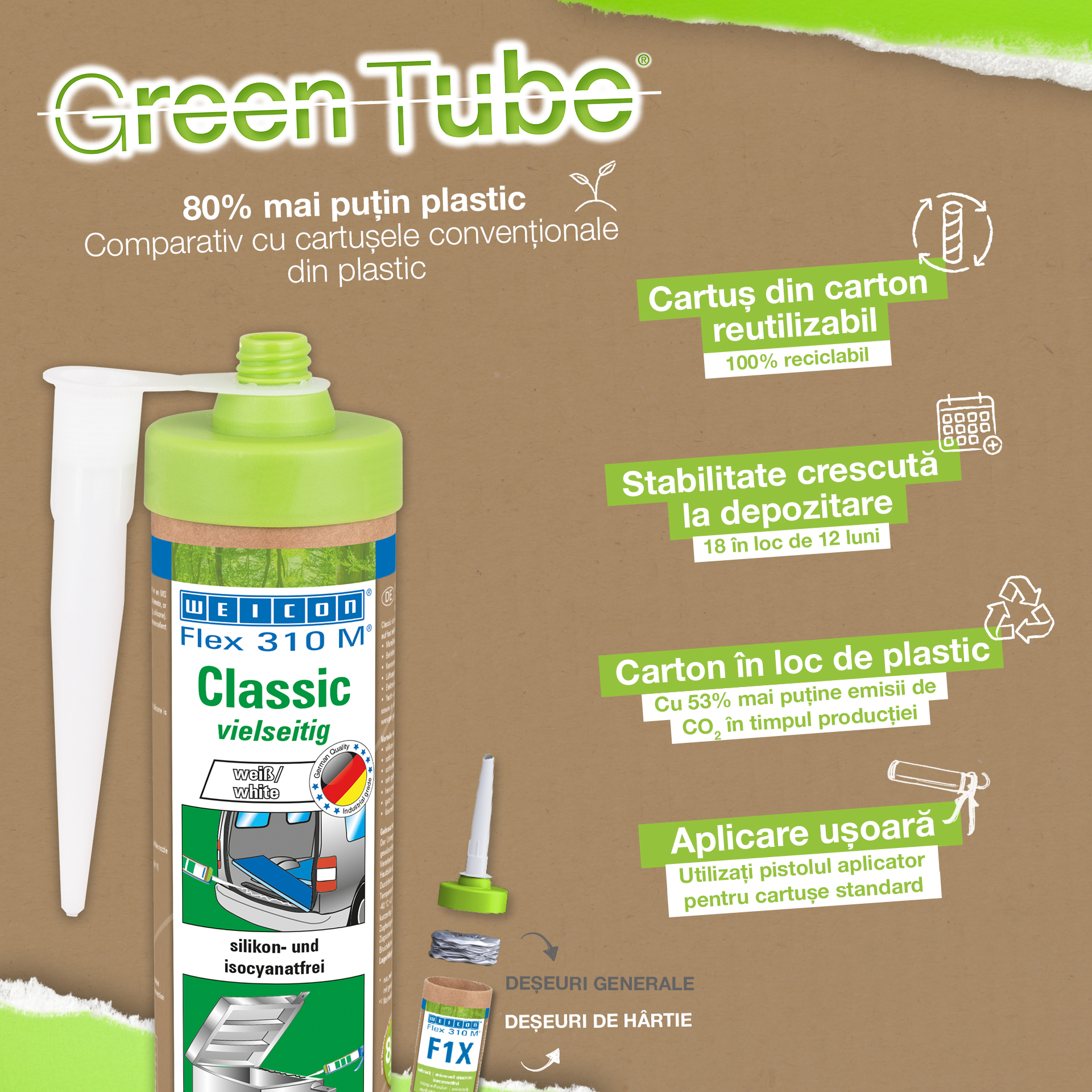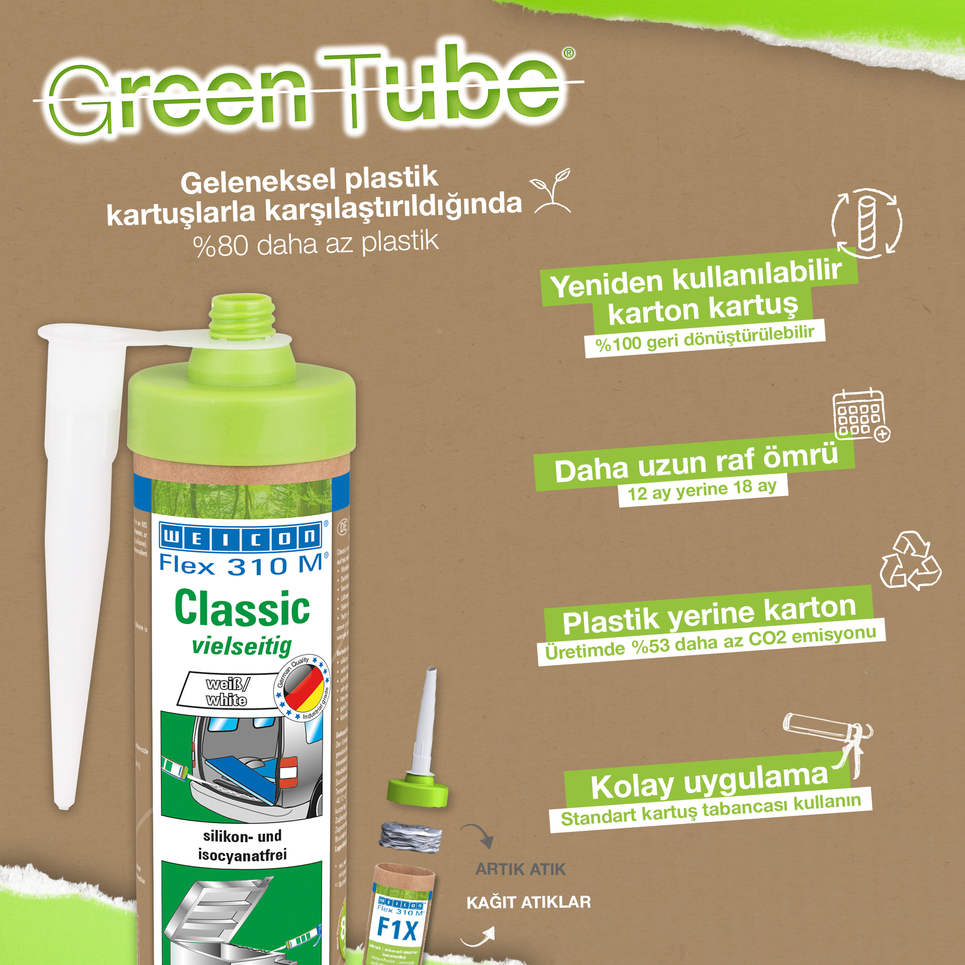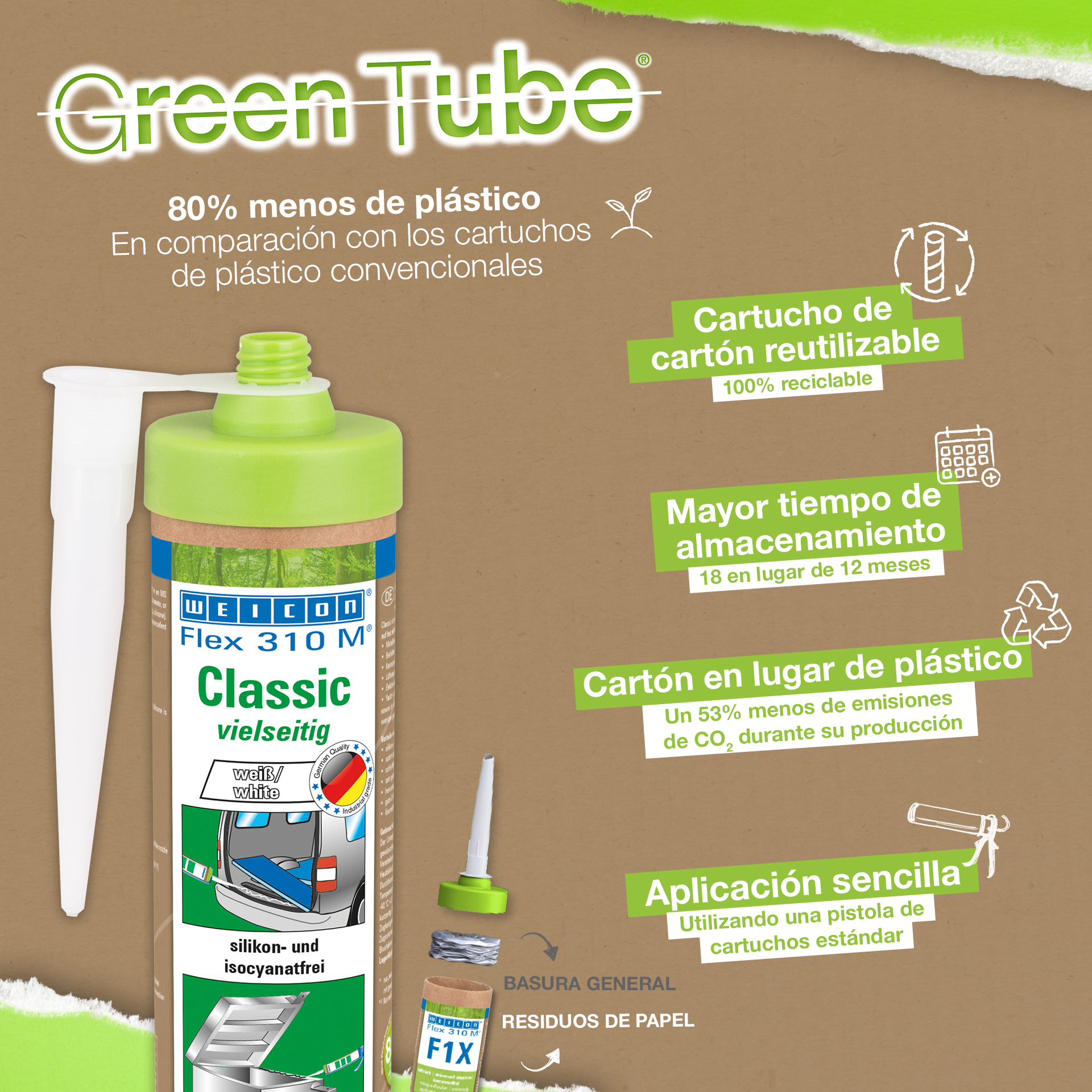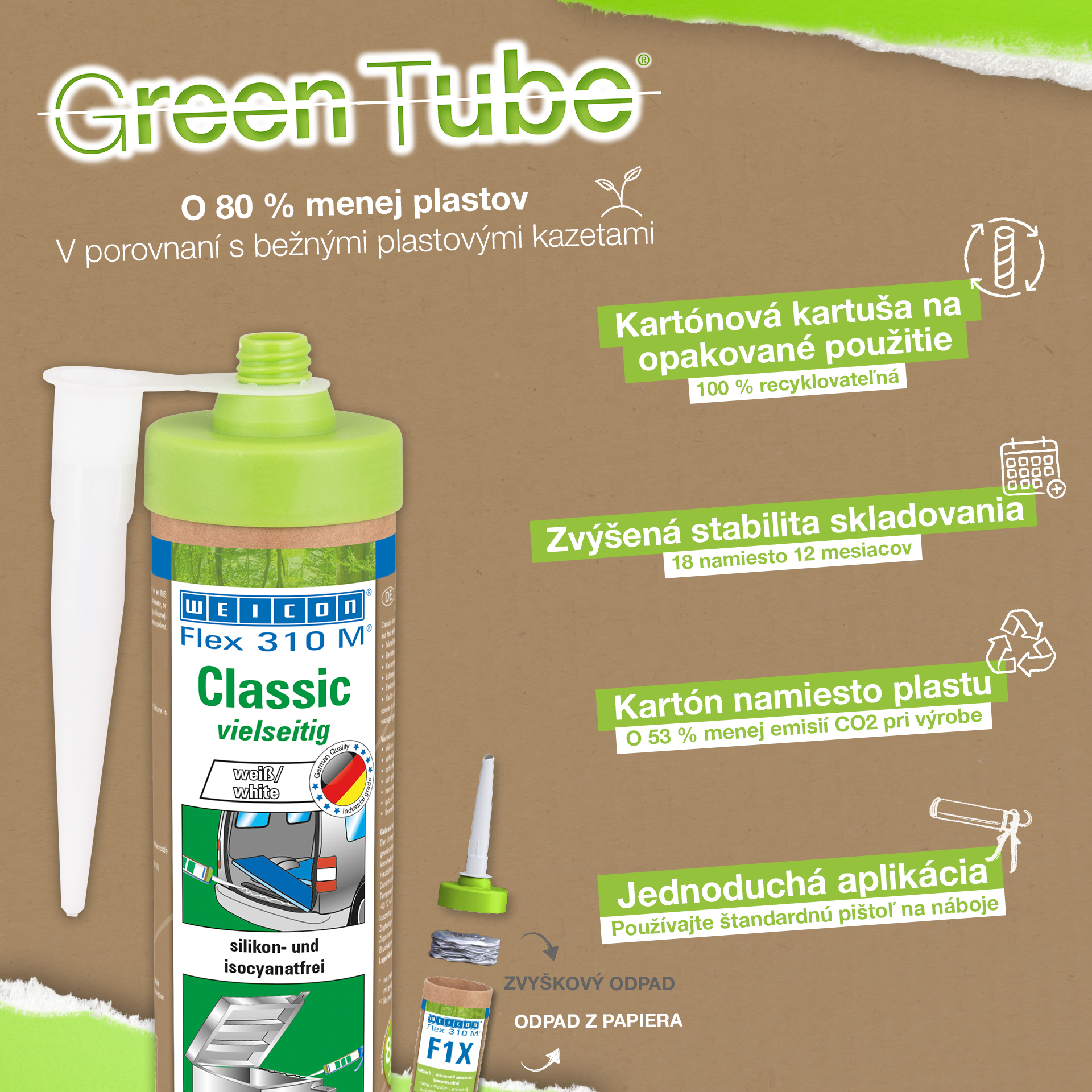 WEICON Flex 310 M® Classico possiede un’elevata qualità aderente, è verniciabile bagnato su bagnato, levigabile, possiede un’ottima resistenza all’invecchiamento e una buona stabilità all’esposizione a raggi UV. È resistente contro l’acqua dolce e salmastra ed esente da siliconi, isocianati, alogeni e solventi. WEICON Flex 310 M® Classico è certificato ISEGA e può essere utilizzato come collante nell’industria alimentare. Flex 310 M® Classico è un collante elastico a base di Polimeri MS ed è adatto per incollaggi su metallo, tanti tipi di plastiche, ceramica, legno, vetro e pietra. Il collante e sigillante trova utilizzo nel settore delle costruzioni metalliche, costruzione di contenitori e apparecchiature, costruzione di carrozzerie, veicoli e container, impianti di ventilazione e condizionatori, nell’industria elettronica, nel settore nautico e laddove l’uso di siliconi o prodotti contenenti silicone non è desiderato.