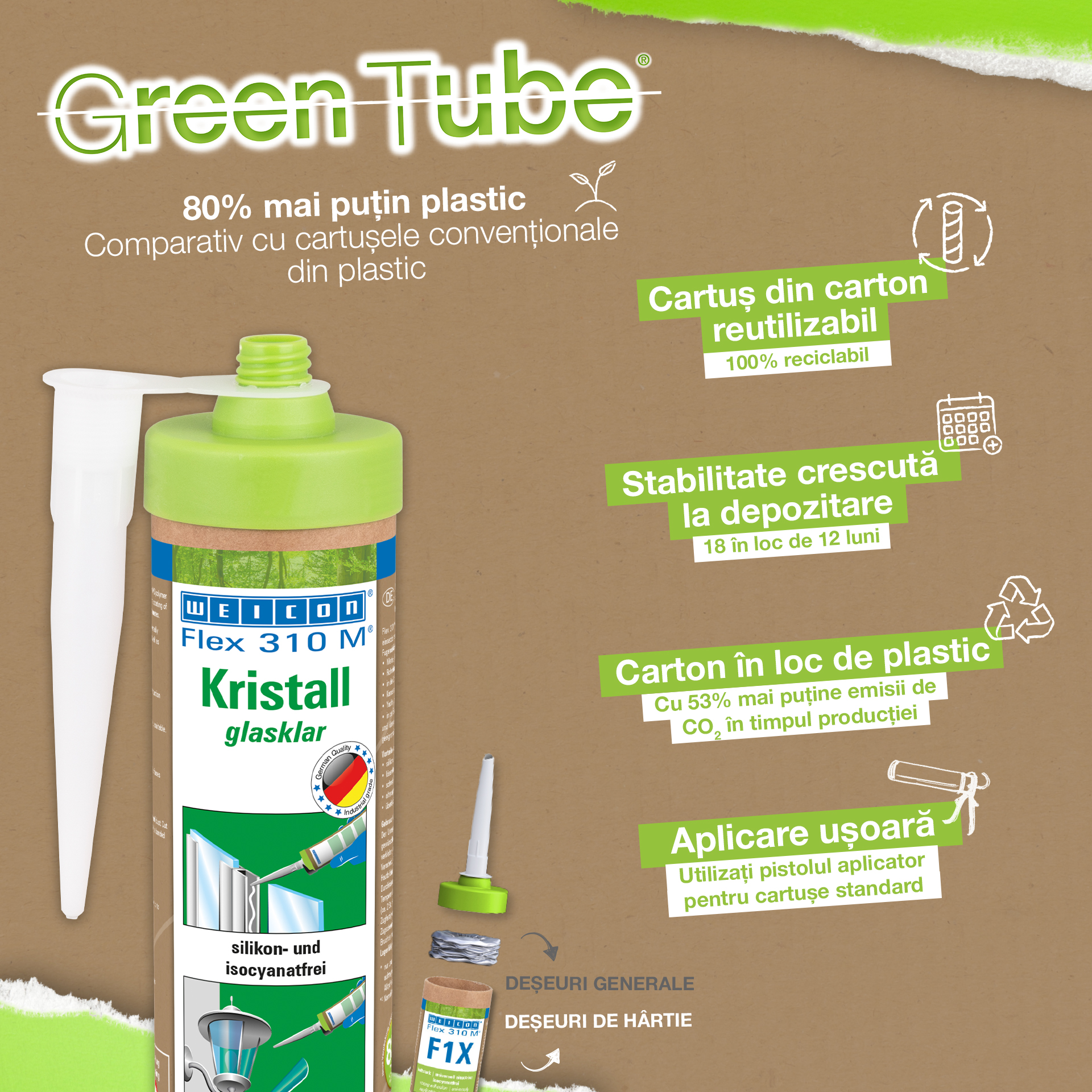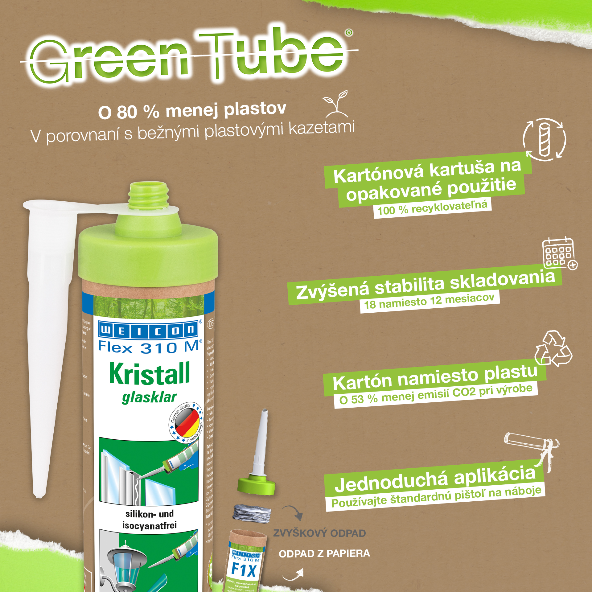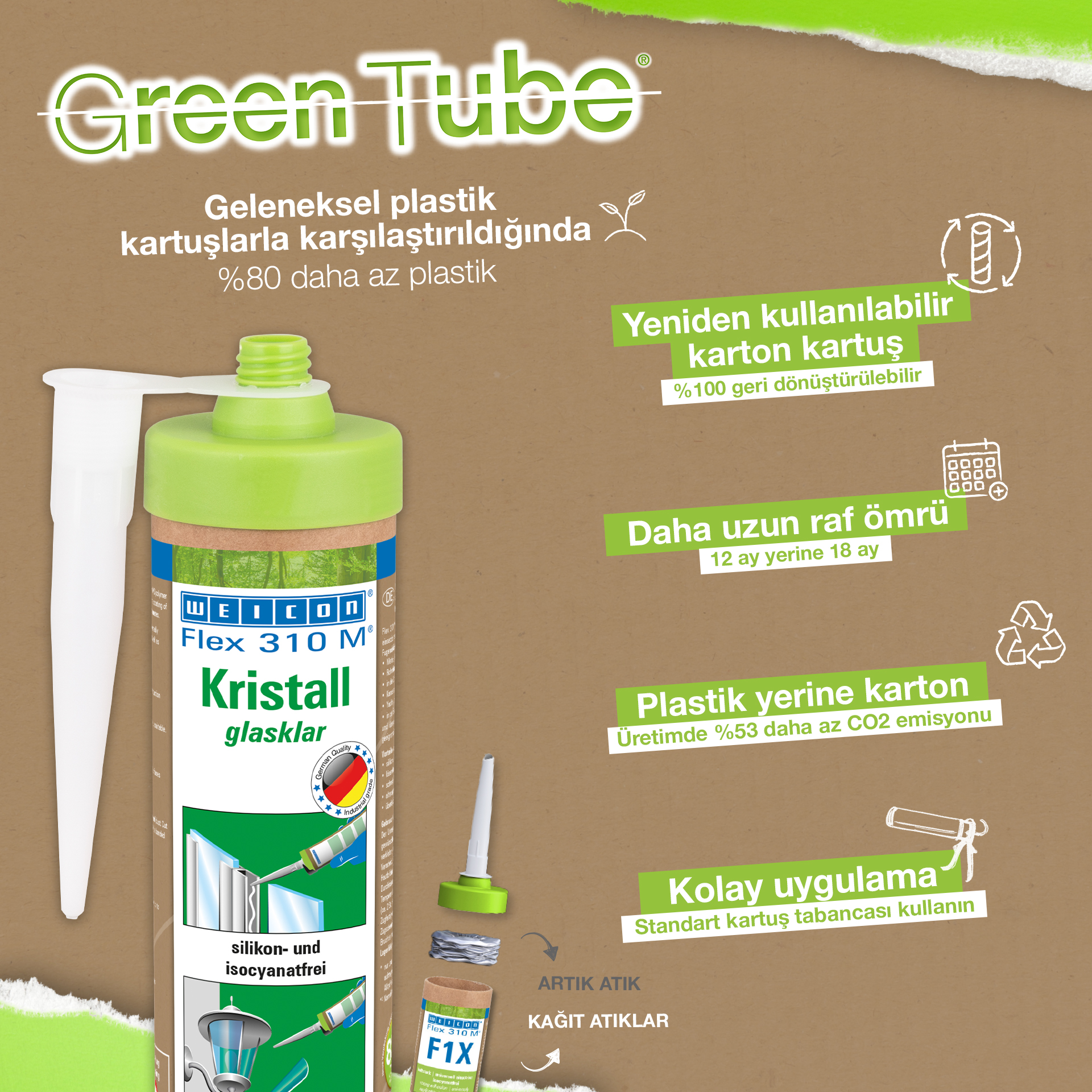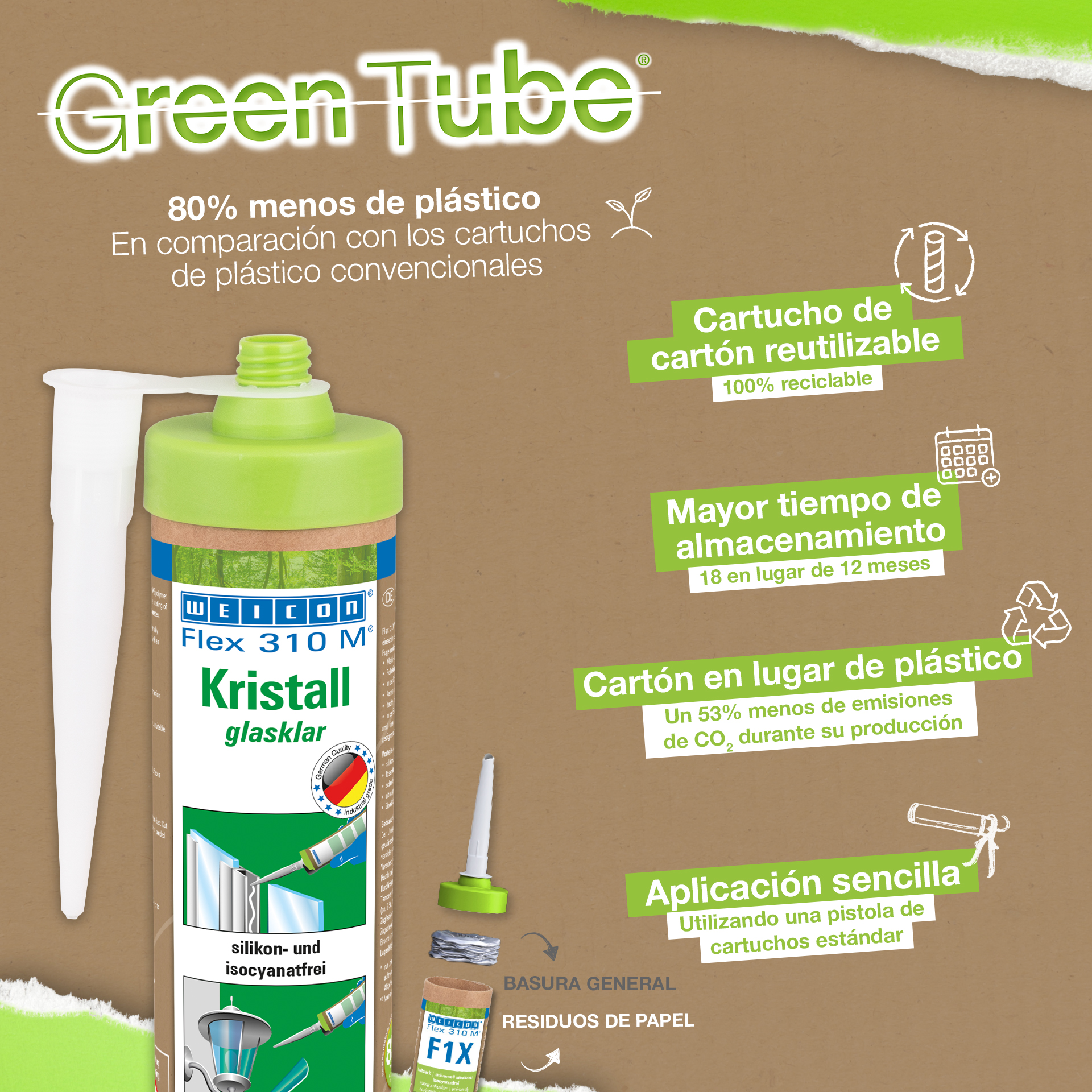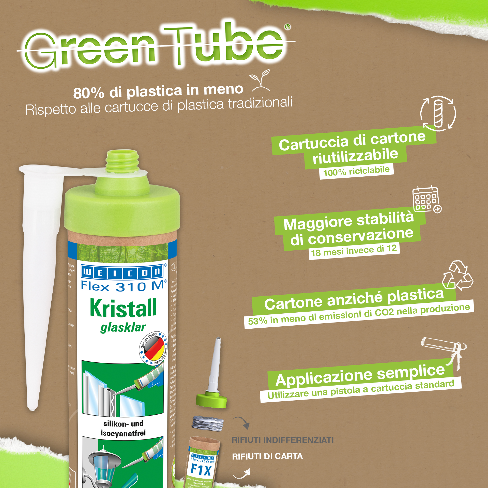 WEICON Flex 310 M Cristallo è molto trasparente (cristallino), possiede un’ottima qualità di adesione, verniciabile bagnato su bagnato, resistente ai raggi UV, e resistente all’acqua e salsedine ed è esente da silicone, isocianati, alogeni e solventi. Il prodotto è certificato ISEGA e può essere utilizzato nell’industria alimentare. WEICON Flex 310 M Cristallo è un collante permanentemente elastico a base di polimeri MS ed è adatto per incollaggi su vetro, PC*, vetro acrilico*, metalli, molte plastiche, ceramica, legno e pietra. Il prodotto è trasparente cristallino a polimerizzazione completata ed è particolarmente adatto per giunzioni elastiche invisibili. Trova impiego nel campo della lavorazione di plastiche, settore del metallo, costruzione di serbatoi e apparecchiature, impianti di ventilazione e condizionatori, nell’industria elettronica e dell’illuminazione, costruzioni nel campo fieristico e vetrine e laddove l’utilizzo di siliconi o prodotti contenti silicone non è desiderato. (* = soltanto per incollaggi non sotto tensione)
