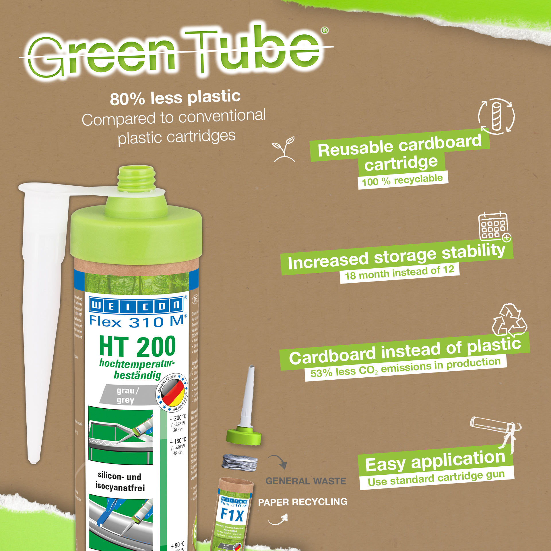 L’alta termostabilità consente di incollare e sigillare componenti che sono destinate a una verniciatura a polvere. WEICON Flex 310 M HT 200 è idoneo per costruzioni in metallo, costruzione di serbatoi e apparecchiature, applicazioni nella tecnologia di ventilazione e aria condizionata, nella costruzione di carrozzeria, container, vagoni e veicoli. WEICON Flex 310 M HT 200 è molto resistente ad alte temperature e all’invecchiamento ed è esente da silicone, isocianati, alogeni e solventi.