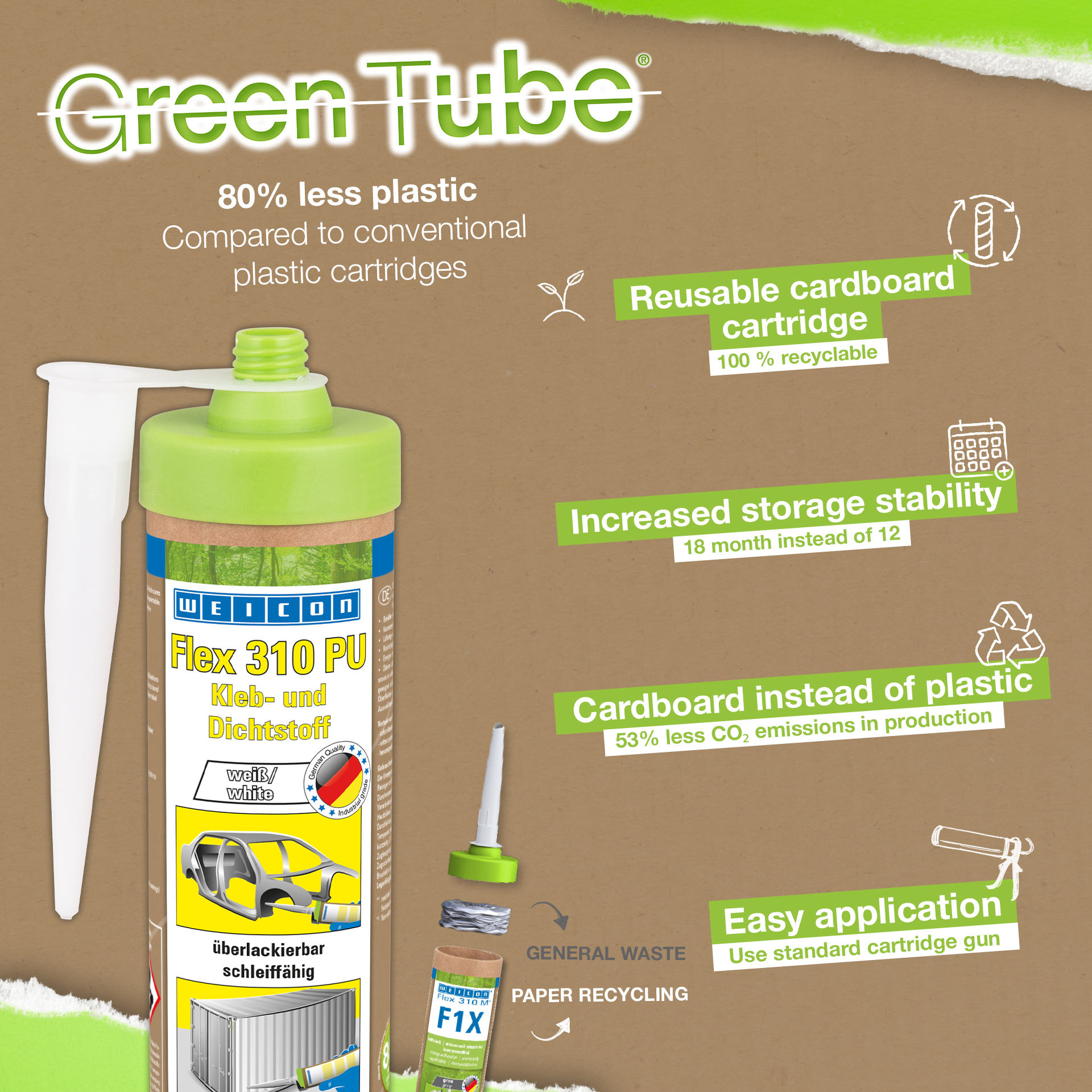 Flex 310 PU è permanentemente elastico, possiede un’eccellente qualità adesiva, è verniciabile, resistente agli agenti atmosferici, all’acqua dolce e salsedine ed è esente da silicone. Questo prodotto è un sigillante e adesivo elastico a base di poliuretano (PUR) idoneo per incollare e sigillare materiali come metallo, plastica, ceramica, legno, vetro e pietra. Trova utilizzo nella costruzione di serbatoi, apparecchiature, carrozzerie, container e veicoli, nella tecnologia di ventilazione e aria condizionata, plastica, nell’industria elettrica e dell’energia nonché dove non è consentito usare silicone.