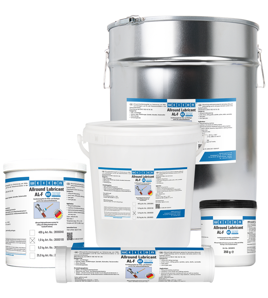 WEICON AL-F va usato per lubrificare cuscinetti rotanti e radenti, giunti, leve, guide di scorrimento, mandrini, alberi a camme e scanalati, cambi ad ingranaggi aperti, ingranaggi a vite senza fine e per tutti i punti di lubrificazione a grasso. Grazie all'approvazione NSF H2, il grasso è adatto all'uso nell'industria alimentare.