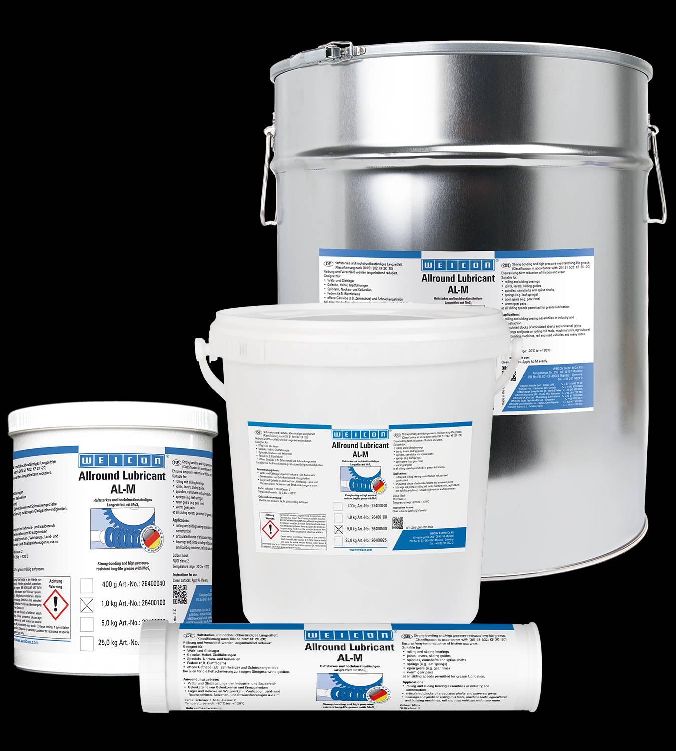 WEICON AL-M riduce l’attrito e l’usura a lungo periodo ed è adatto per la lubrificazione di cuscinetti rotanti e radenti, giunti, leve, guide di scorrimento, mandrini, alberi a camme e scanalati, molle, cambi ad ingranaggi aperti e ingranaggi a vite senza fine e a tutte le velocità di scorrimento per le quali è consentita la lubrificazione a grasso.