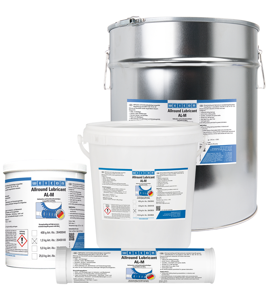 WEICON AL-M riduce l’attrito e l’usura a lungo periodo ed è adatto per la lubrificazione di cuscinetti rotanti e radenti, giunti, leve, guide di scorrimento, mandrini, alberi a camme e scanalati, molle, cambi ad ingranaggi aperti e ingranaggi a vite senza fine e a tutte le velocità di scorrimento per le quali è consentita la lubrificazione a grasso.
