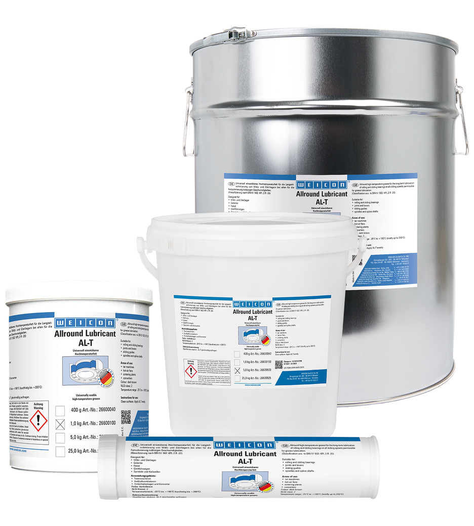 WEICON AL-T è adatto per la lubrificazione di cuscinetti rotanti e radenti, giunti, leve, guide di scorrimento, mandrini, alberi scanalati e per tutte le velocità di scorrimento consentite per la lubrificazione con grasso. WEICON AL-T può essere utilizzato in numerevoli settori dell’industria.