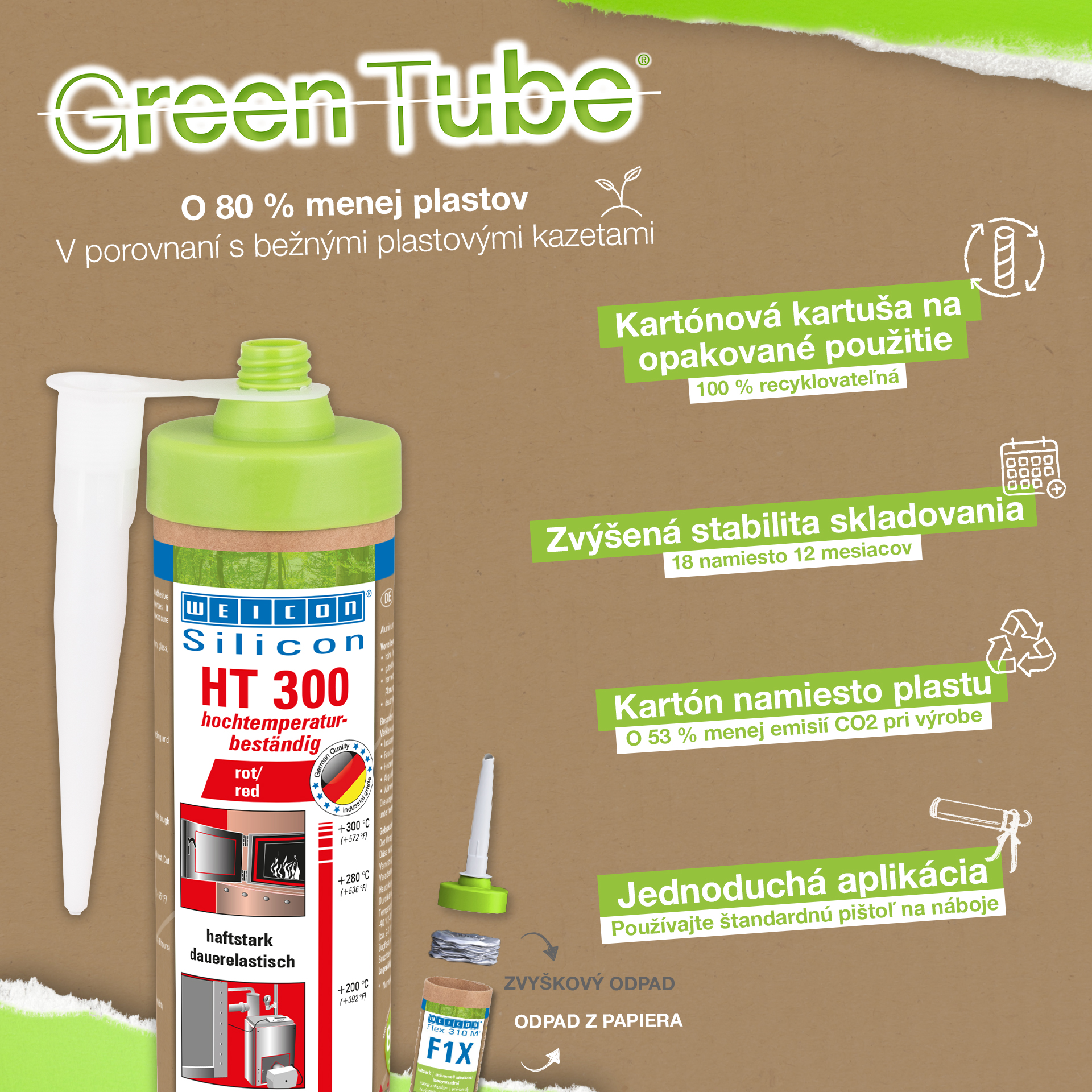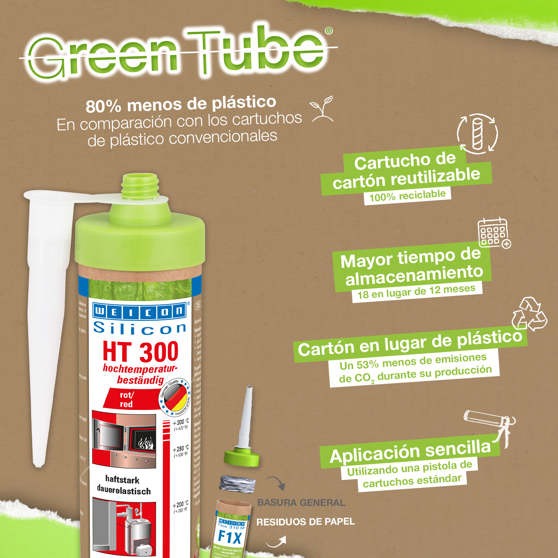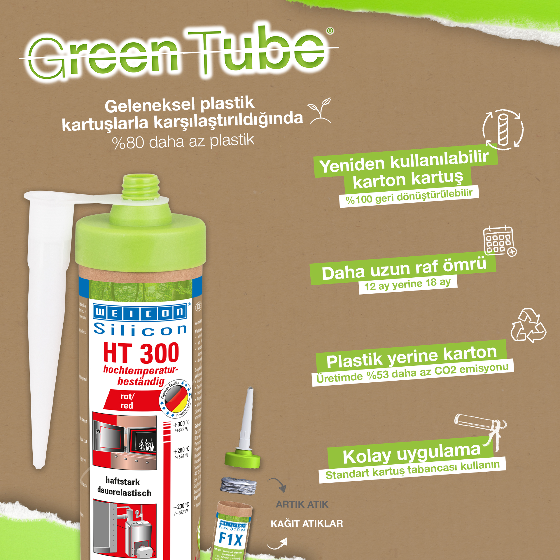 WEICON HT 300 è molto resistente alle temperature fino a (+300 °C/+572 °F), esente da solventi, alta qualità adesiva, acetico, resistente agli agenti atmosferici, chimici e all’invecchiamento inoltre è molto elastico (allungamento alla rottura ca. 300%). Il prodotto e adatto in particolare per incollaggi e sigillature termoresistenti e aderisce in modo ottimale ad acciaio, alluminio, vetro, ceramica e tanti altri materiali. L’adesivo e sigillante può essere utilizzato in forni industriali, sistemi di gas combusti, sistemi di riscaldamento, condotti per evacuazione gas di scarico, camere calde e molti altri settori.