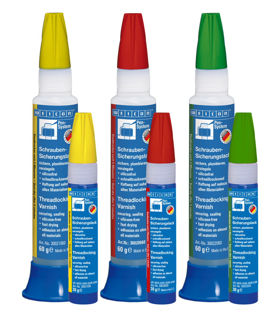 WEICON Lacca Sigillaviti è una lacca a base di solventi che asciuga molto velocemente e manifesta un’ottima adesione su quasi tutti i materiali. Serve per la sigillatura o marcatura di viti e bulloni su macchinari, ecc… La lacca funge da sigillo rimovibile come protezione alla manomissione da estranei, come rivestimento di elementi sotto tensione e come protezione alla corrosione influenzata da contatto. WEICON Lacca Sigillaviti possiede un’ottima resistenza all’acqua, benzina, gasolio, oli minerali, paraffinici, acidi ed alcalini diluiti. WEICON Lacca Sigillaviti è indispensabile per la sigillatura di giunzioni filettate di tutti i tipi, protegge da manipolazione e rimozione non autorizzata di viti e giunzioni, garantisce la sicurezza della qualità, dei controlli di produzione e del prodotto e serve per il controllo visivo di componenti accoppiati ed allineati. Lacca Sigillaviti è disponibile nei colori giallo, verde e rosso.