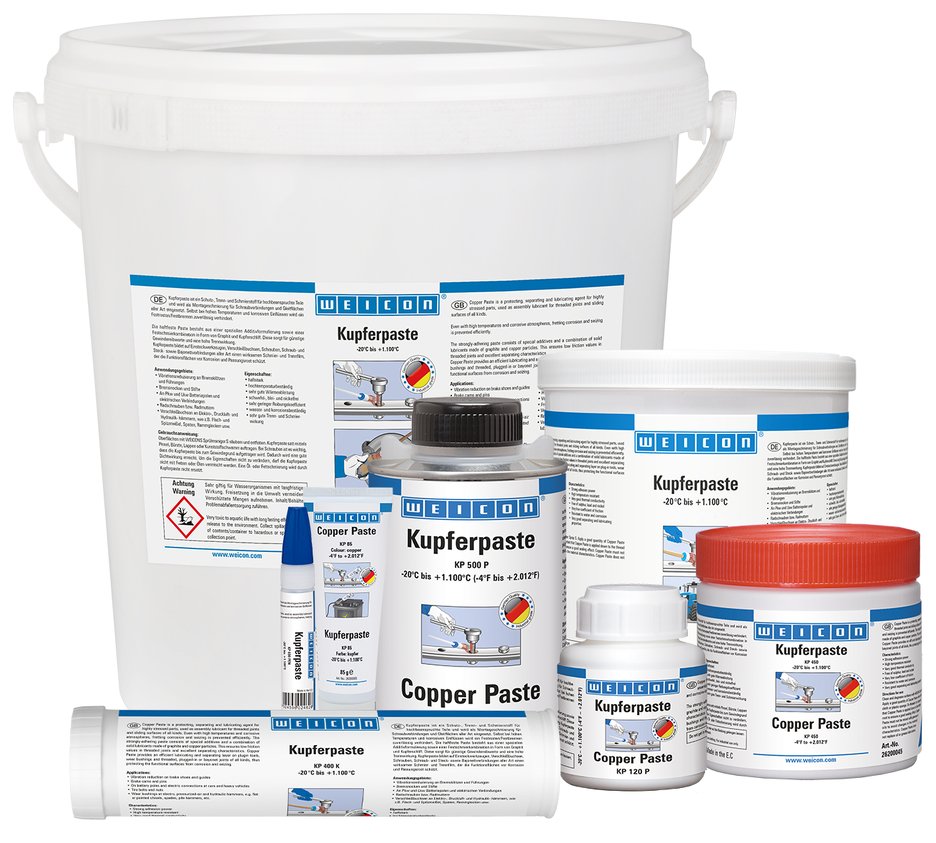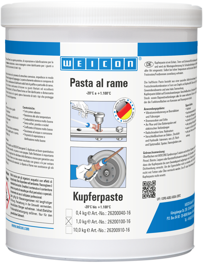 WEICON Pasta al Rame è un protettivo, un distaccante e un lubrificante, tutto in un unico prodotto. È resistente ad alte temperature, alla corrosione, ha un’alta forza di adesione ed è esente da zolfo, piombo e nichel. WEICON Pasta al Rame va usato come antigrippante per giunzioni a vite e piani di scorrimento di tutti i tipi. Forma una pellicola lubrificante e distaccante su attrezzi per innesti, boccole, viti e giunzioni di viti, spine e baionette di tutti i tipi che protegge da corrosione e usura da sfregamento. Si applica per la riduzione di vibrazioni su impianti freni, su guide, su pastiglie freni, su perni, sui poli di batteria di veicoli nonché su altre giunzioni elettriche, nonché su viti e dadi per ruote e boccole su martelli elettrici, pneumatici e idraulici.