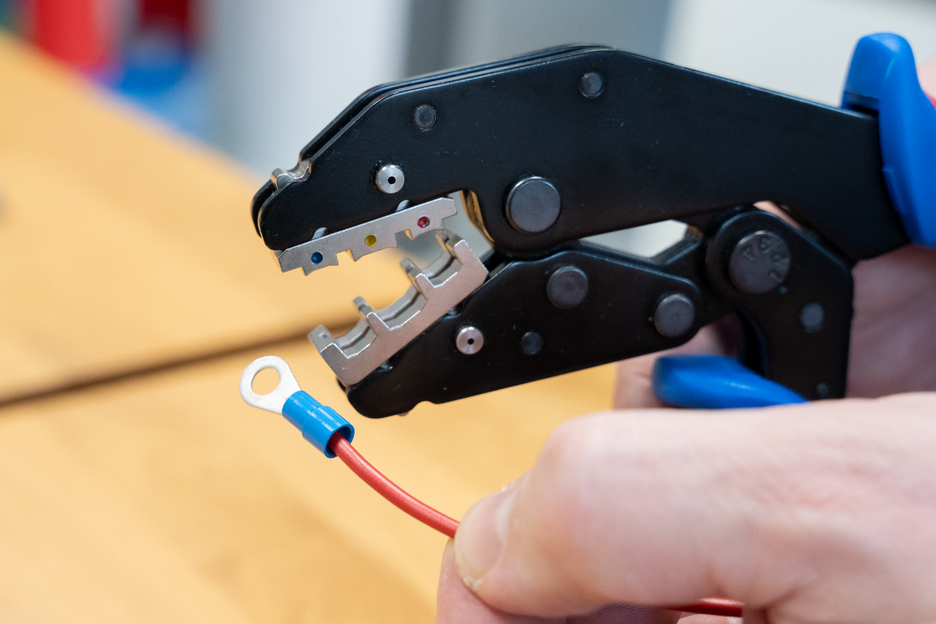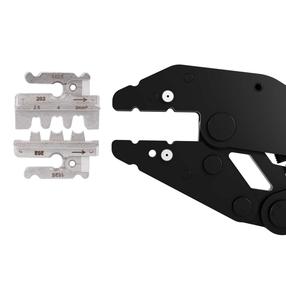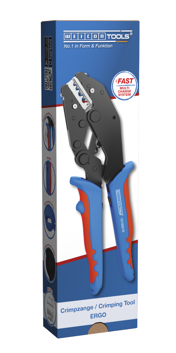 ERGO-CRIMP è stato sviluppato per la crimpatura sicura e affidabile di vari connettori elettrici. L’utensile è dotato di un meccanismo a cricchetto con dispositivo di bloccaggio, che garantisce una qualità di crimpatura costantemente elevata e risultati precisi e ripetibili. Il meccanismo apre lo strumento solo al termine della crimpatura. Inoltre, nell’impugnatura è integrato uno sblocco d’emergenza che consente all’operatore di aprire l’utensile in qualsiasi momento, ad esempio in caso di uso improprio. Un’altra caratteristica distintiva è la regolazione della forza di crimpatura, che assicura una qualità elevata grazie all’impostazione eccentrica precisa. Con il sistema Multi Change, i moduli di crimpatura possono essere sostituiti rapidamente secondo necessità. Il semplice sistema di cambio, che non richiede attrezzi aggiuntivi, permette un’installazione e una rimozione rapide dei moduli. L’utensile ERGO-CRIMP include tre coppie di moduli in acciaio di alta qualità. Una coppia è adatta per connettori MC4 con sezioni di cavo da 2,5 mm², 4 mm² e 6 mm² (AWG 14-10). Un’altra coppia è studiata per puntalini isolati da 0,25 a 6 mm² (AWG 24-10). La terza coppia è progettata per occhielli isolati da 0,5 a 6 mm² (AWG 22-10). Le tre coppie di moduli sono conservate in modo sicuro e protette dalla polvere in una piccola scatola di plastica. Sono inoltre disponibili come accessori ulteriori coppie di moduli. Le impugnature bimateriale garantiscono una presa antiscivolo e un’ergonomia ottimale per la massima trasmissione della forza. È stato utilizzato il collaudato design “ice-crack” che assicura una sensazione di comfort durante l’uso. Gli occhielli integrati nelle impugnature consentono il fissaggio di un dispositivo di sicurezza.