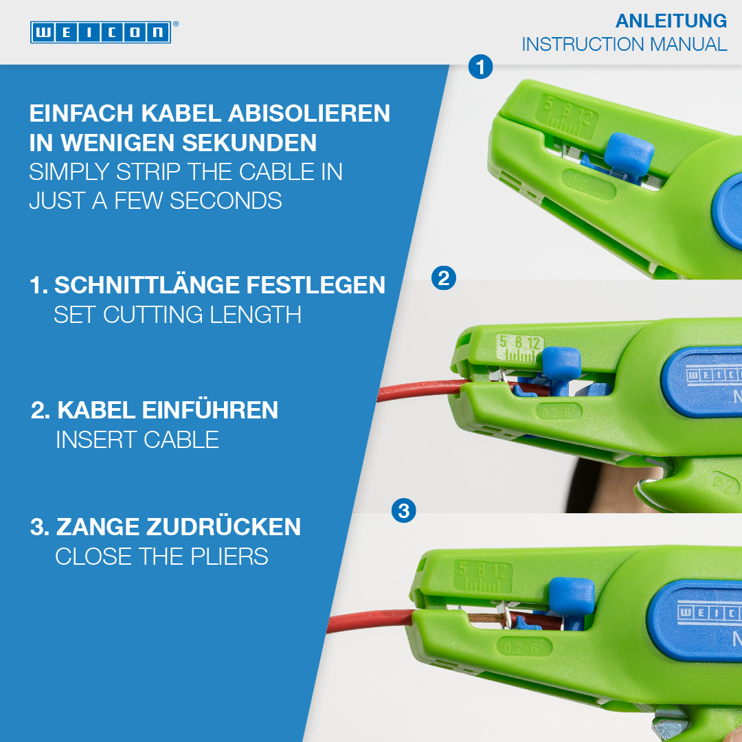 Attenzione: Usare gli utensili spelafili WEICON è consentito solo su cavi e contatti liberi da potenziale e da tensione.