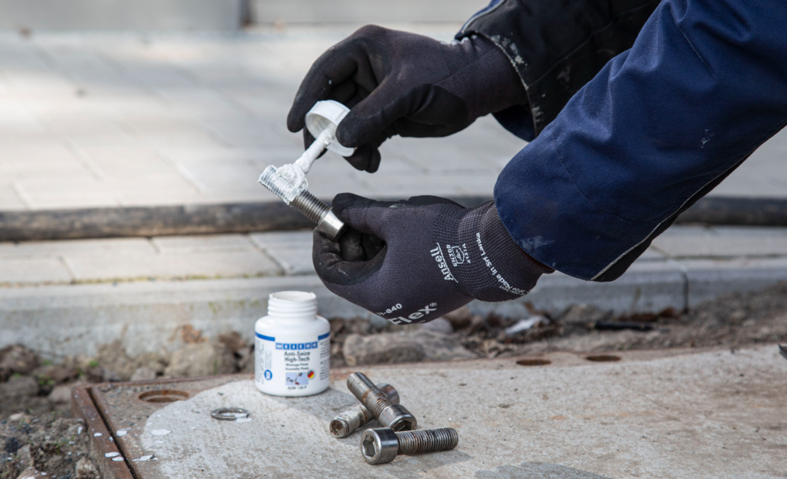 Le paste di montaggio, al contrario, hanno un alto contenuto di lubrificante solido, solitamente tra il 30 e il 50 percento. Ciò significa che sono adatte per temperature di lavoro elevate, carichi ad alta pressione o condizioni meteorologiche esterne permanenti. Proteggono da ossidazione, corrosione, sfregamento, effetti stick-slip e "saldatura a freddo". Le paste di montaggio vengono utilizzate dove il movimento è minimo o nullo, ma dove agiscono forze molto elevate. Ecco perché sono il lubrificante ideale per giunzioni a vite o pressatura di perni e bulloni. Assicurano che i giunti a vite "attacchino", ma che possano comunque essere smontati in qualsiasi momento.
