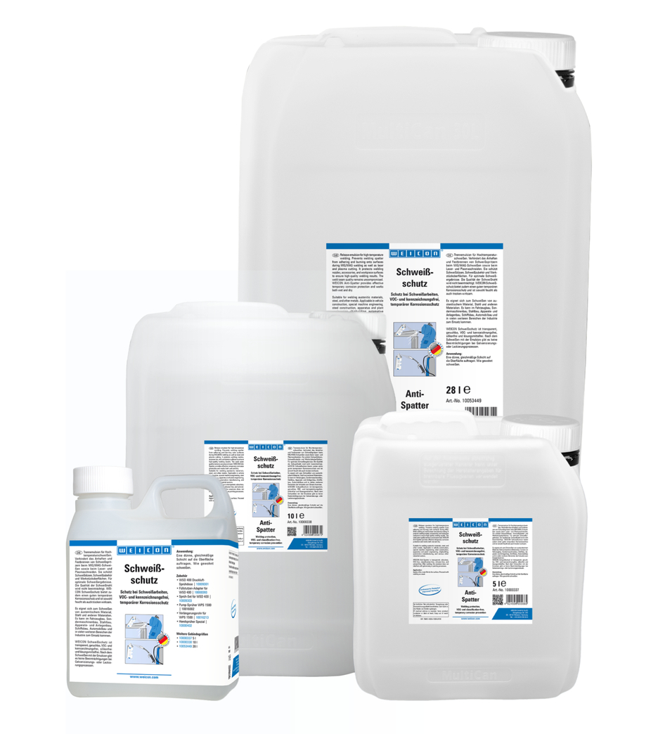 Protettivo per la Saldatura "Bio" WEICON è un'emulsione distaccante per la saldatura ad alta temperatura. Impedisce agli schizzi di saldatura di attaccarsi e bruciare durante la saldatura MIG/MAG e il taglio laser e al plasma. Protegge gli ugelli di saldatura, gli accessori di saldatura e le superfici dei pezzi. Per ottenere risultati di saldatura ottimali. La qualità del cordone di saldatura non viene compromessa. Protettivo per la Saldatura "Bio" WEICON offre anche una buona protezione temporanea dalla corrosione ed è efficace sia a umido che a secco. È adatto alla saldatura di materiali austenitici, acciaio e altri metalli. Può essere utilizzato nella costruzione di veicoli, nella costruzione di macchine speciali, nella costruzione di acciaio, nella costruzione di apparecchi e impianti, nella costruzione navale, nella costruzione di automobili e in molti altri settori industriali. Protettivo per la Saldatura "Bio" WEICON è trasparente, inodore, privo di VOC e di etichette, senza silicone e senza solventi. Dopo la saldatura con l'emulsione, non ci sono effetti negativi sui processi di zincatura o verniciatura.