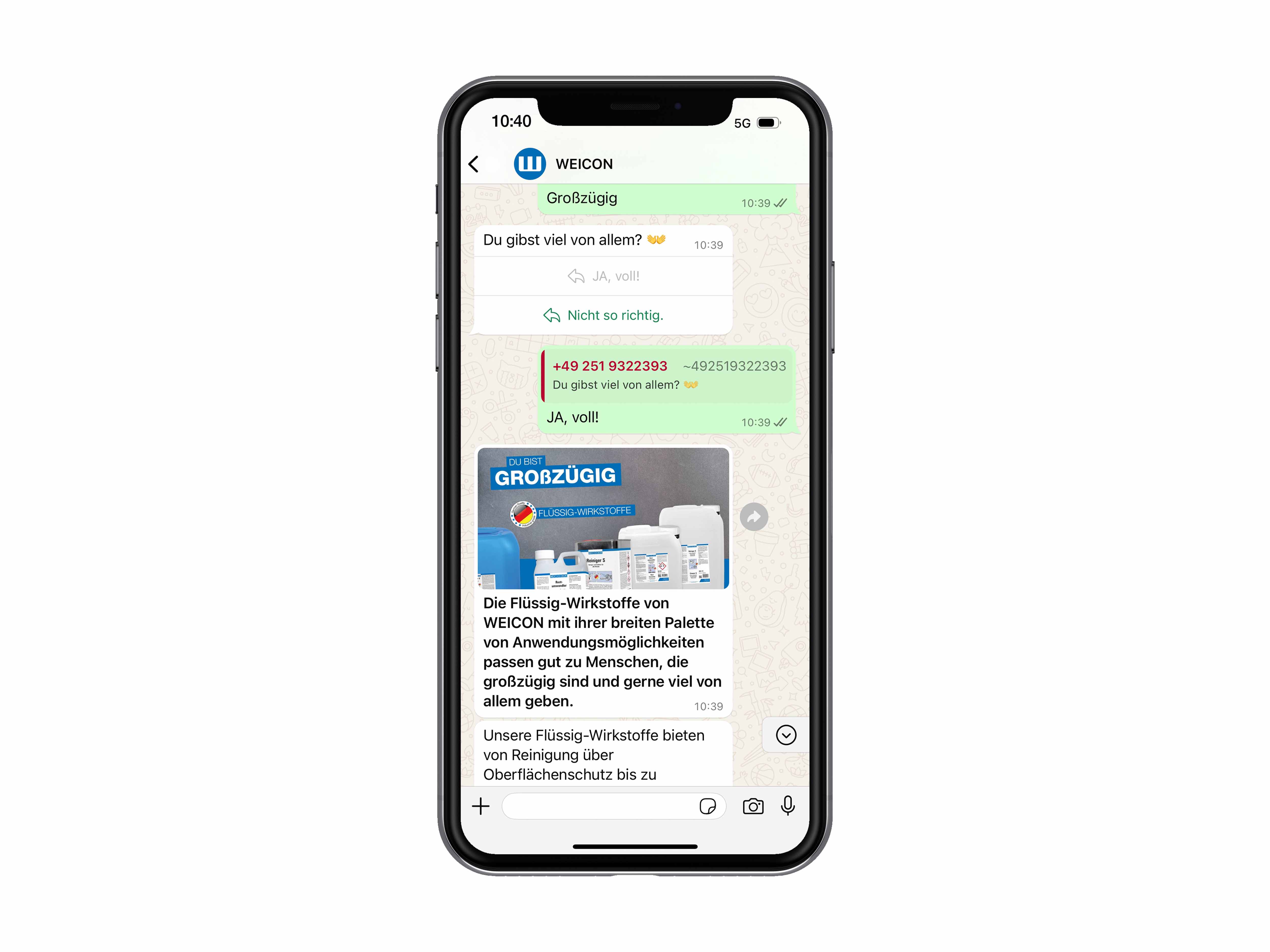 Sei interessato ai nostri prodotti in generale? Ma non sai, ad esempio, se preferisci utilizzare un olio o un grasso lubrificante, un adesivo monocomponente o bicomponente, o se hai bisogno dello strumento giusto? Allora scopri di più con l'aiuto del nostro servizio WhatsApp e fai il nostro test "Che tipo di WEICON sono io?" su WhatsApp.