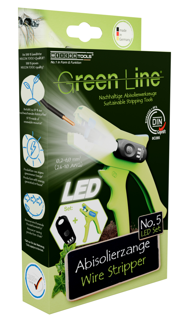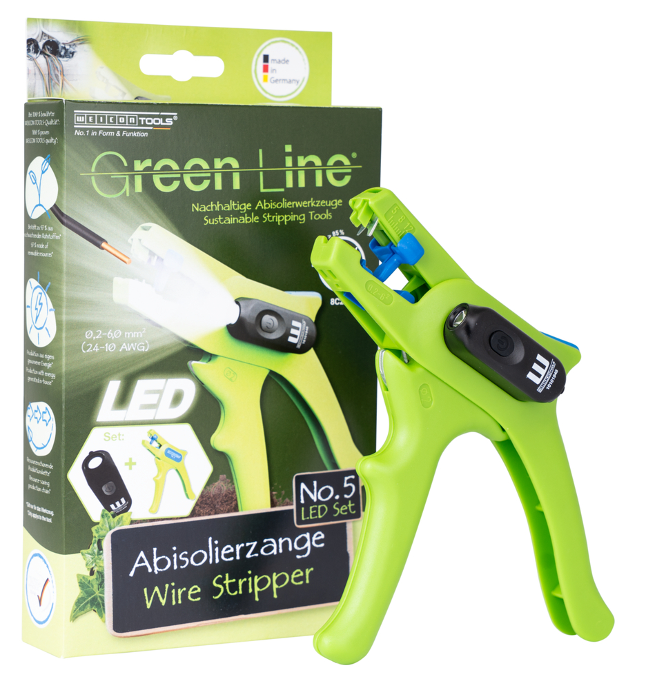 Spellafili No. 5 Green Line: Spellafili No. 5 Green Line: I salvaspazio grazie al meccanismo di blocco I spelafili automatico per tutti i conduttori flessibili e rigidi più comuni (0,2 – 6,0 mm²) I utilizzo molto semplice I lavorazione precisa grazie al fermo di lunghezza regolabile (5–12 mm) Lampada da lavoro a LED: luce LED integrata per un’area di lavoro ben illuminata, che consente di lavorare in sicurezza con entrambe le mani I potente batteria al litio ricaricabile da 180 mAh I 2 ore di luce intensa (al livello 2) dopo un tempo di ricarica di 40 minuti I tre livelli di luminosità fino a 250 lumen, colore luce: 6500K I custodia antipolvere, resistente agli spruzzi e agli urti in policarbonato, testata secondo il codice di protezione IP65 I utilizzabile con molti spellafili WEICON TOOLS