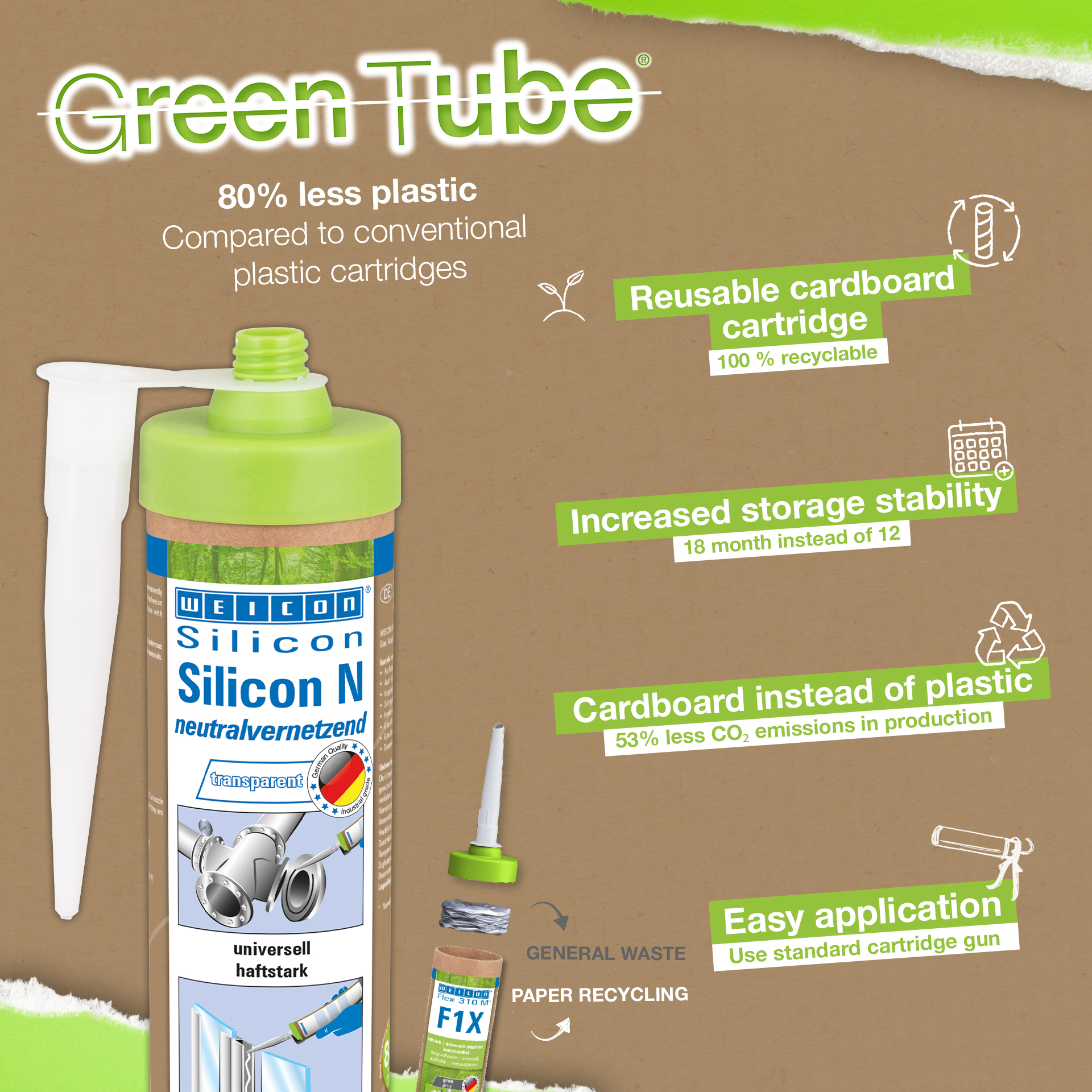 WEICON Silicone N è privo di solventi, con reticolazione neutra, non corrosivo, possiede alta qualità adesiva, è permanentemente elastico, resistente agli agenti atmosferici, all’invecchiamento, ad agenti chimici e a temperature fino a +180 °C (+356 °F), molto elastico (allungamento alla rottura di ca. 550%) ed è applicabile universalmente. Silicone N attacca molto bene su metalli, vetro, ceramica e tanti altri materiali. WEICON Silicone N trova utilizzo nella lavorazione delle plastiche, nell’industria elettronica, nella tecnologia dell’energia, nell’industria dell’illuminazione, nel campo fieristico e in tanti altri settori industriali.