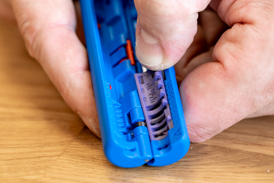 With the Profibus Stripper No. 2, the outer sheath and the underlying shield can be cleanly cut in order to strip the Profibus cable according to its connector. The optical length scale in the module can be used to select the appropriate stripping length to prepare the Ethernet cables to fit the FastConnect connector. For the stripping lengths of 17 mm, 20 mm, 24 mm and 30 mm, the usual dimensions are visually marked in the module. The stripper was developed to cut Profibus cables in the range of 5.5 mm to 8 mm with two pairs of blades simultaneously for a precise fit. The cutting pattern creates an ideal preparation for FastConnect connectors - even with different cable diameters. If necessary, the pairs of knives in the half-shells can be replaced or renewed as modules.
