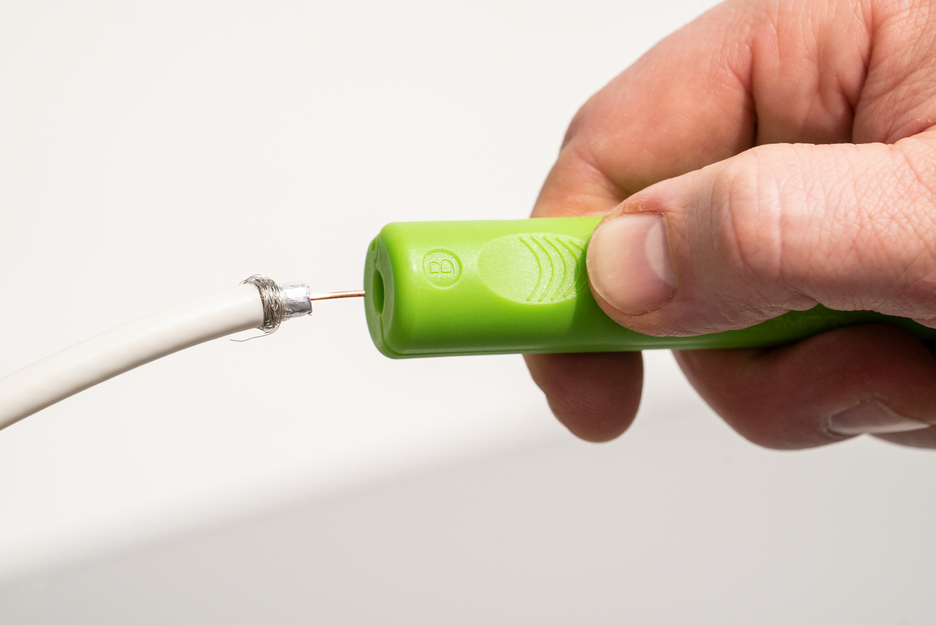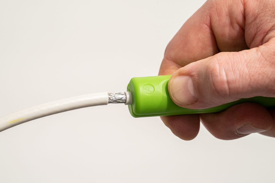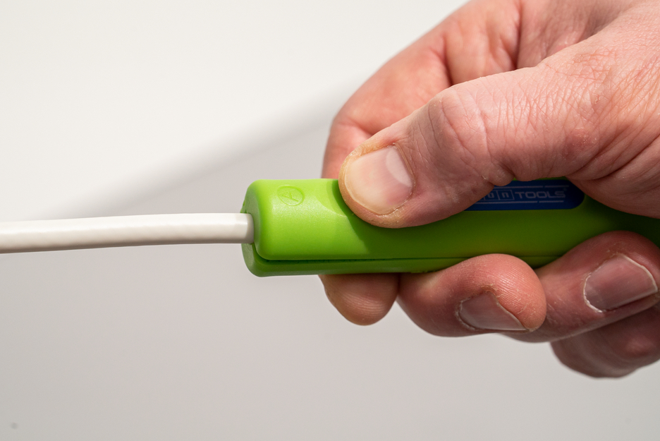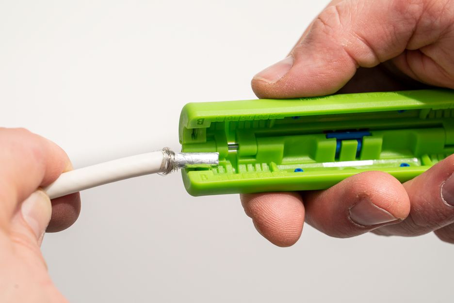Range di lavoro 4,8 - 7,5 mm Ø L'impostazione della profondità di taglio non è necessaria. Adatto anche per cavi flessibili scala di lunghezza (0- 25 mm) integrata nell'alloggiamento Sguainatura regolabile gradualmente per tutti i cavi coassiali più comuni