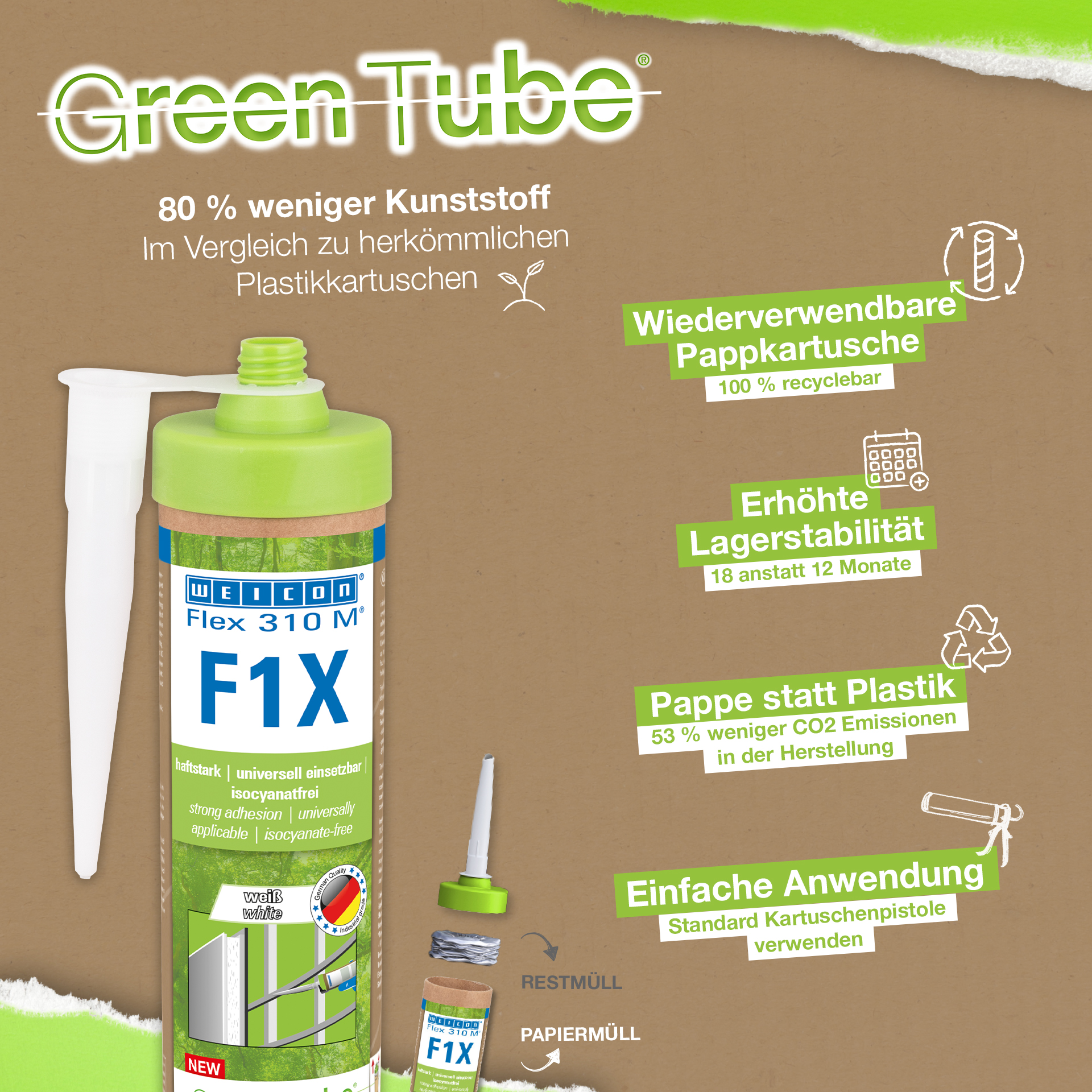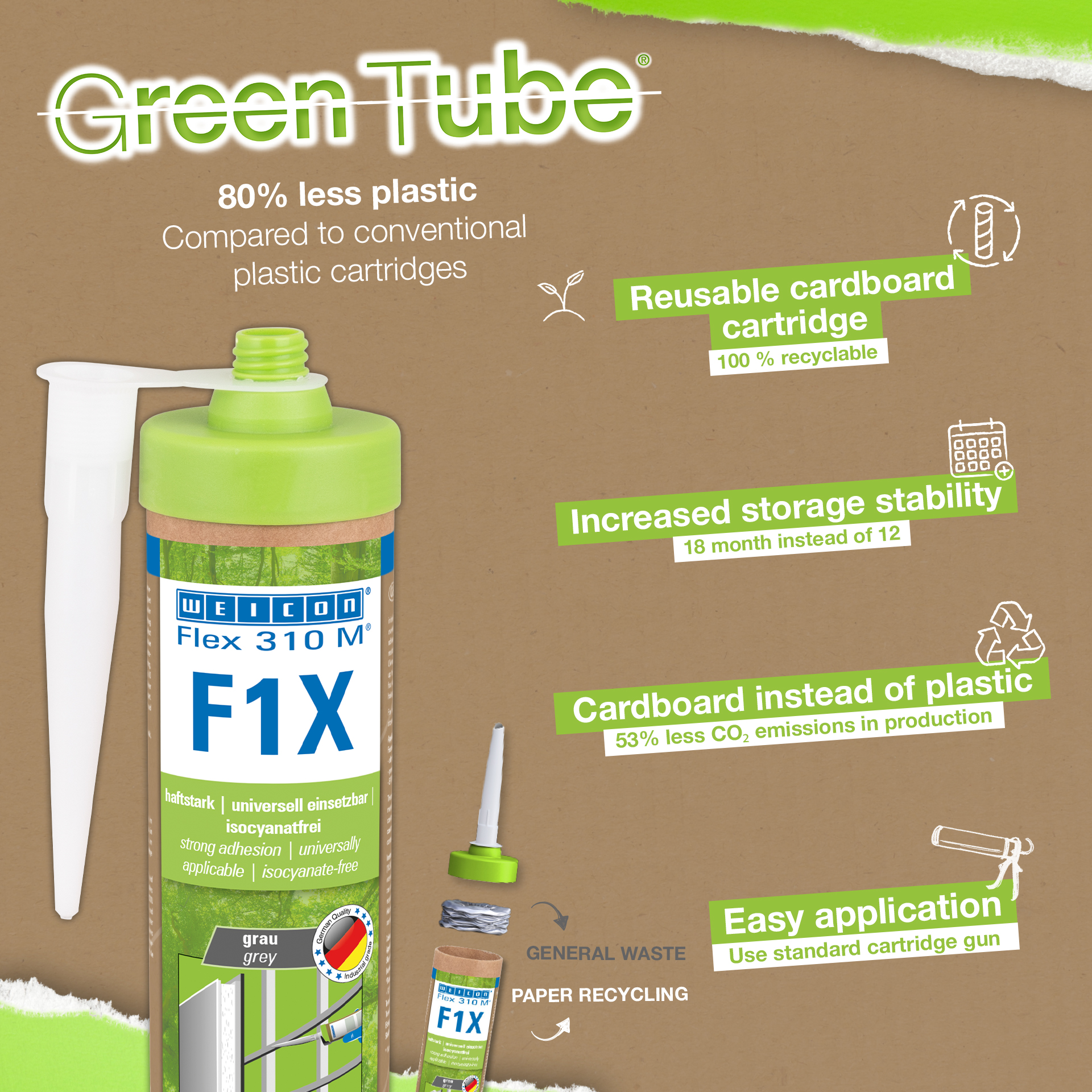 WEICON Flex 310 M F1X è un adesivo e sigillante elastico a base di polimeri MS. L'adesivo grigio è molto resistente e universalmente adatto per fissare in modo permanente quasi tutti i materiali su una varietà di superfici. Grazie all'elevatissima adesione iniziale, l'incollaggio è possibile su superfici verticali e anche sopraelevate, sia all'interno che all'esterno. Ad esempio, Flex 310 M F1X può essere utilizzato per incollare tra loro metalli, molte plastiche, ceramiche, legno, vetro e pietra. L'adesivo è permanentemente elastico e può essere verniciato "bagnato su bagnato", è carteggiabile, resistente agli agenti atmosferici, all'umidità, all'invecchiamento, alla muffa e ai raggi UV. Può resistere a temperature fino a 180 °C per un breve periodo (fino a 30 minuti) e può essere verniciato a polvere dopo un tempo di indurimento di quattro giorni. L'adesivo e il sigillante sono privi di silicone, isocianati, alogeni e solventi e non sono corrosivi. Flex 310 M F1X può essere utilizzato per fissare battiscopa, listelli, strisce, cornici, pannelli, tavole, piastrelle, pietre e pellicole EPDM. Può essere utilizzato nella costruzione di muri a secco e di interni, nella costruzione di metalli, nella costruzione di serbatoi e apparecchi, nella costruzione di container, nella tecnologia di ventilazione e condizionamento, nella costruzione di fiere e negozi, nella costruzione di yacht e imbarcazioni e ovunque i siliconi o i prodotti contenenti silicone non siano adatti. Confezionamento sostenibile - altrettanto resistente! Green Tube, il packaging sostenibile: la punta e il coperchio sono realizzati in plastica riciclata al 100% e il corpo della cartuccia è interamente in cartone. Questo significa minori emissioni di CO₂ e un ridotto utilizzo di plastica rispetto alle cartucce convenzionali, il tutto senza compromettere le prestazioni!