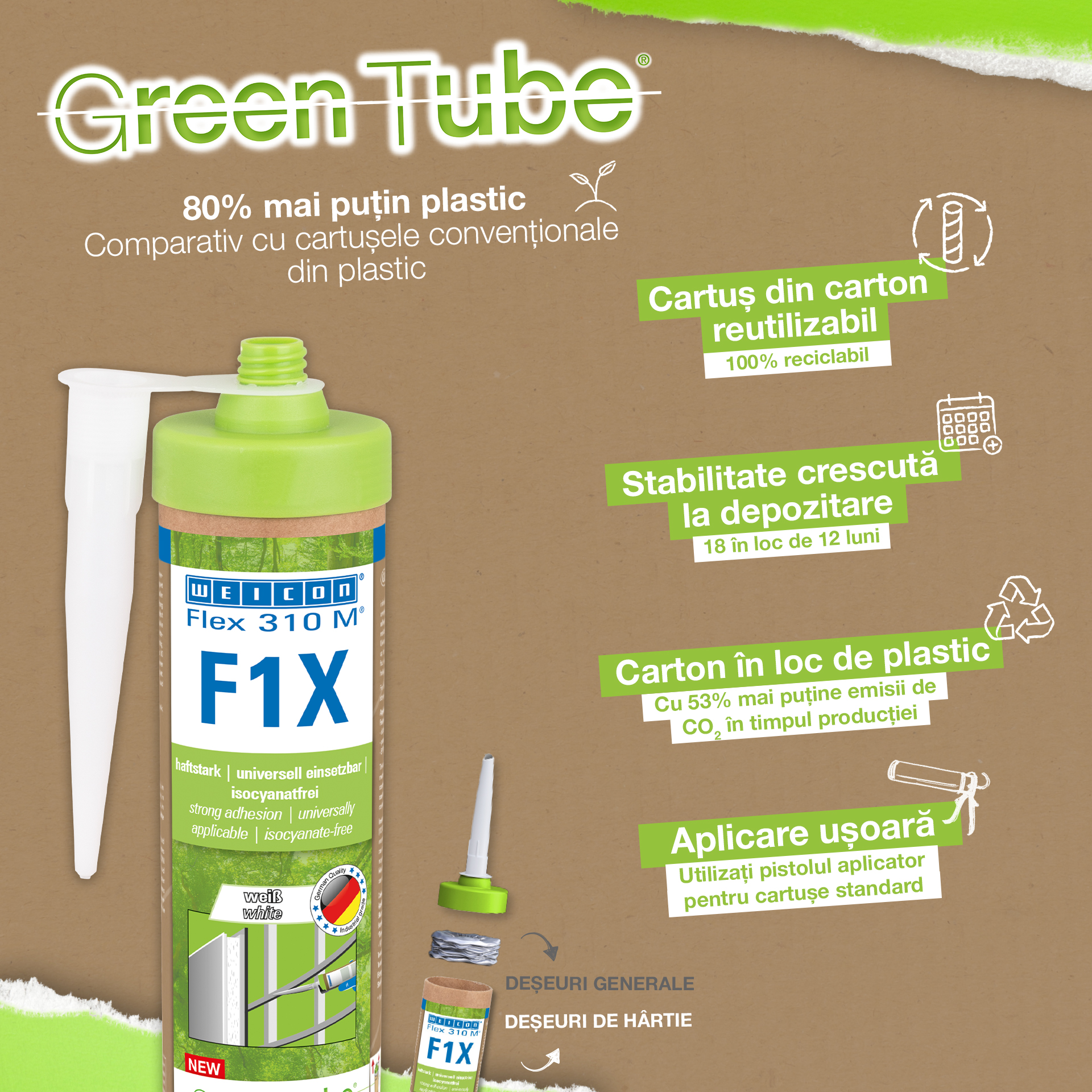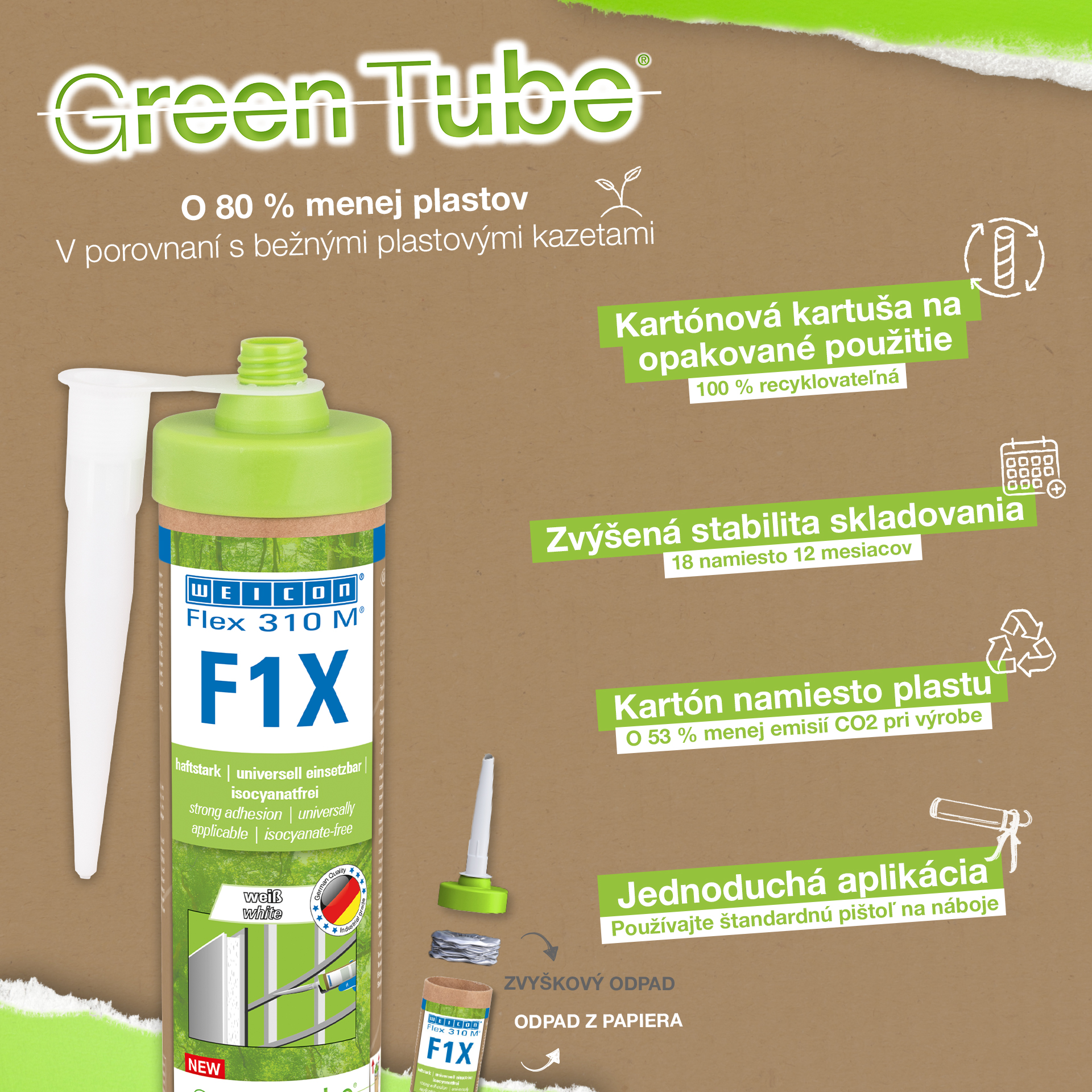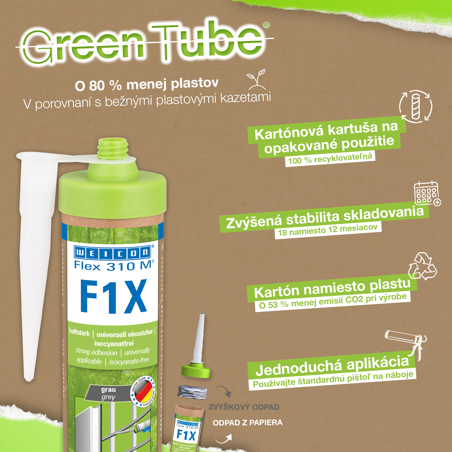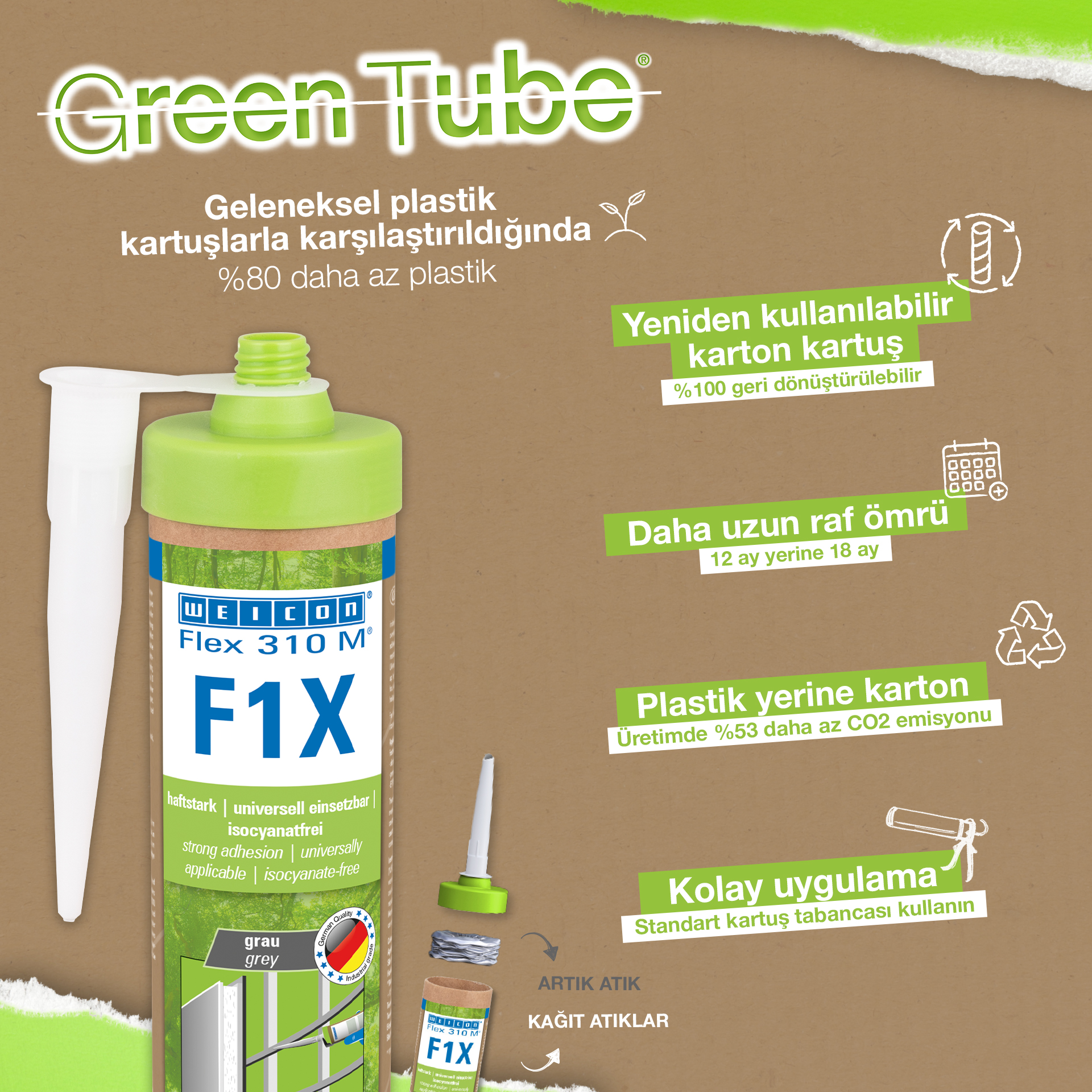 WEICON Flex 310 M F1X è un adesivo e sigillante elastico a base di polimeri MS. L'adesivo grigio è molto resistente e universalmente adatto per fissare in modo permanente quasi tutti i materiali su una varietà di superfici. Grazie all'elevatissima adesione iniziale, l'incollaggio è possibile su superfici verticali e anche sopraelevate, sia all'interno che all'esterno. Ad esempio, Flex 310 M F1X può essere utilizzato per incollare tra loro metalli, molte plastiche, ceramiche, legno, vetro e pietra. L'adesivo è permanentemente elastico e può essere verniciato "bagnato su bagnato", è carteggiabile, resistente agli agenti atmosferici, all'umidità, all'invecchiamento, alla muffa e ai raggi UV. Può resistere a temperature fino a 180 °C per un breve periodo (fino a 30 minuti) e può essere verniciato a polvere dopo un tempo di indurimento di quattro giorni. L'adesivo e il sigillante sono privi di silicone, isocianati, alogeni e solventi e non sono corrosivi. Flex 310 M F1X può essere utilizzato per fissare battiscopa, listelli, strisce, cornici, pannelli, tavole, piastrelle, pietre e pellicole EPDM. Può essere utilizzato nella costruzione di muri a secco e di interni, nella costruzione di metalli, nella costruzione di serbatoi e apparecchi, nella costruzione di container, nella tecnologia di ventilazione e condizionamento, nella costruzione di fiere e negozi, nella costruzione di yacht e imbarcazioni e ovunque i siliconi o i prodotti contenenti silicone non siano adatti. Confezionamento sostenibile - altrettanto resistente! Green Tube, il packaging sostenibile: la punta e il coperchio sono realizzati in plastica riciclata al 100% e il corpo della cartuccia è interamente in cartone. Questo significa minori emissioni di CO₂ e un ridotto utilizzo di plastica rispetto alle cartucce convenzionali, il tutto senza compromettere le prestazioni!