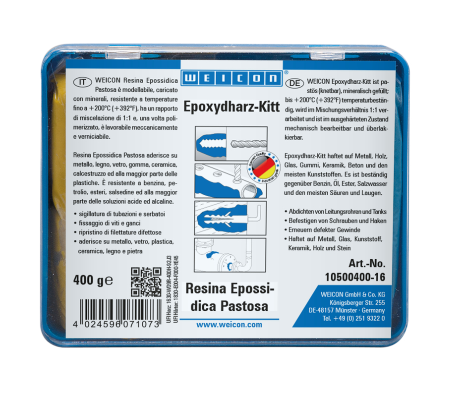 WEICON Resina Epossidica Pastosa è una massa bicomponente modellabile e priva di metalli. Il prodotto permette un impiego polivalente. Il prodotto è idoneo per la riparazione e la manutenzione di componenti pressofusi, per lavori su alberi, cuscinetti radenti, pompe e scatole, per rinnovare filetti rovinati, per la produzione di modelli e stampi e per riparature su alluminio, metalli leggeri e componenti pressofusi. La massa può essere adoperata per sigillare tubazioni e serbatoi e per fissare viti e ganci. Può essere utilizzato per la risoluzione di danni da corrosione e vaiolatura oppure per la riparazione di buchi e cavità. La Resina Epossidica Pastosa aderisce particolarmente bene su tutti i metalli ed anche su ceramica, vetro, pietra, cemento, legno, gomma e molte plastiche. Una volta indurita, la Resina Epossidica Pastosa WEICON può essere lavorata meccanicamente e verniciata, ed è resistente a benzina, olio, estere, acqua salata e la maggior parte degli acidi e degli alcali. Offre elevata termostabilità fino a +200 °C (+392 °F), non è magnetica né corrosiva. Grazie al semplice rapporto di miscelazione di 1:1 in base al peso e al volume, la resina e il catalizzatore possono essere separati in porzioni molto facilmente nella quantità desiderata. WEICON Resina Epossidica Pastosa trova utilizzo nella costruzione di macchinari, di attrezzature, modelli, stampi, prototipi nonché in tanti altri settori industriali.